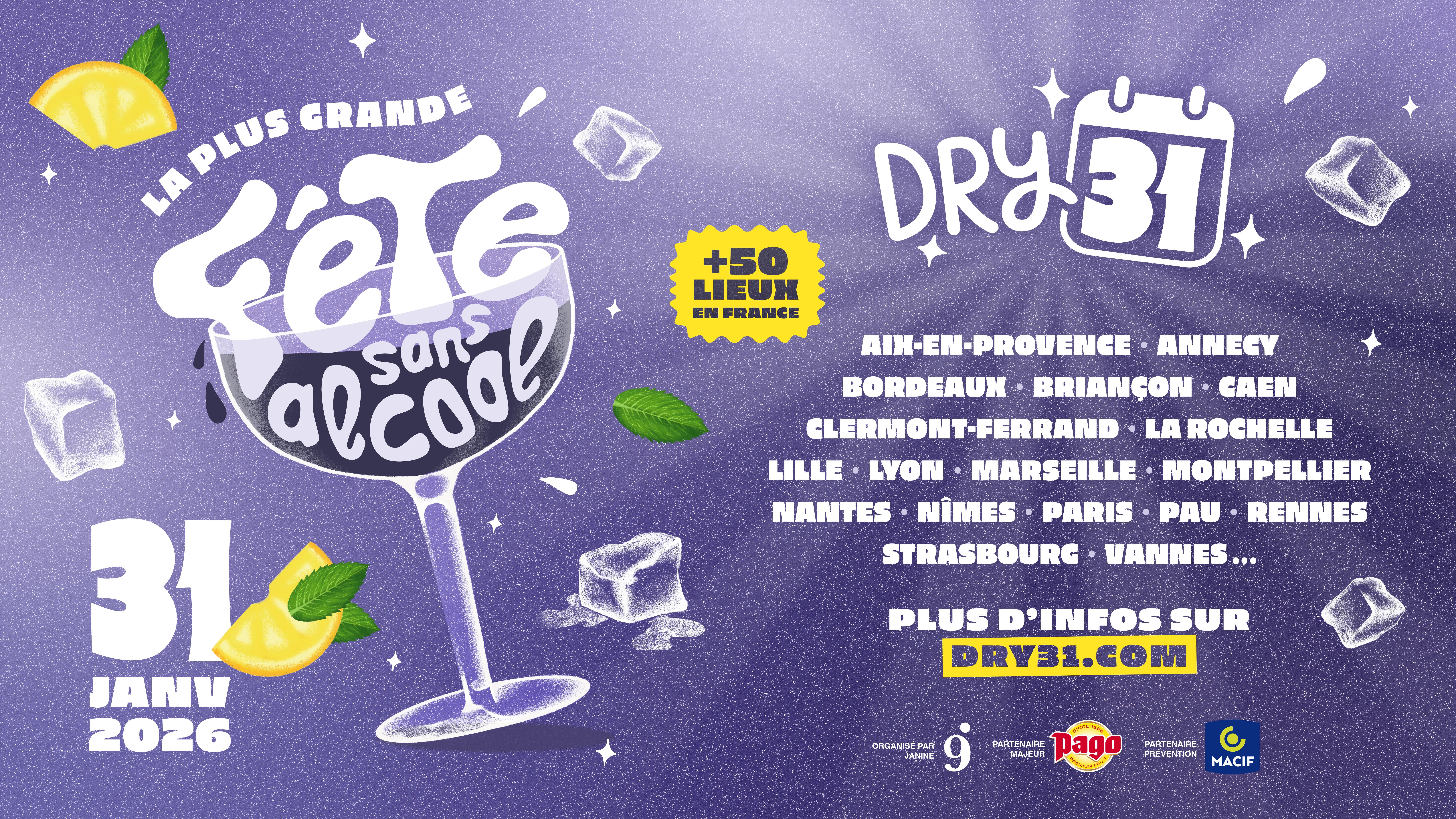 DRY31 débarque à Lyon le 31 janvier ! La plus grande fête sans alcool de France arrive... et ça se passe aussi chez nous ! Ce samedi, de midi à minuit, plus de 50 lieux dans toute la France s’unissent pour réinventer la fête, sans alcool mais avec un max d’énergie. Et à Lyon, trois rendez-vous immanquables t’attendent : chez Deuxième Verre avec DJ set & moktails de 17h à 1h, chez Karsk Spirits avec danse, musique et dégustations de 14h à 19h et enfin au Livestation DIY avec initiation au mix et DJ set de 19h à 1h.