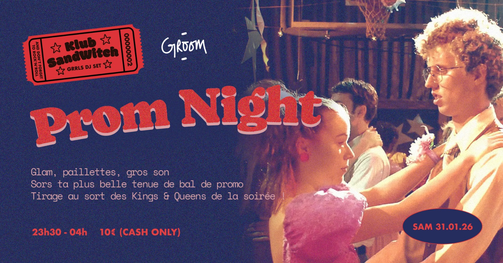 Ce samedi 31 janvier dès 23h30, place à la Prom Night du Klub Sandwitch au Groom : slows mythiques, banquettes moelleuses, playlist ultra décomplexée, déco léchée et cocktails bien sentis. Sortez les robes de bal, costumes kitsch, coiffures rétro : ici, tout le monde est King & Queen ! Spoiler : vous risquez d’y laisser votre voix… et quelques souvenirs mémorables...