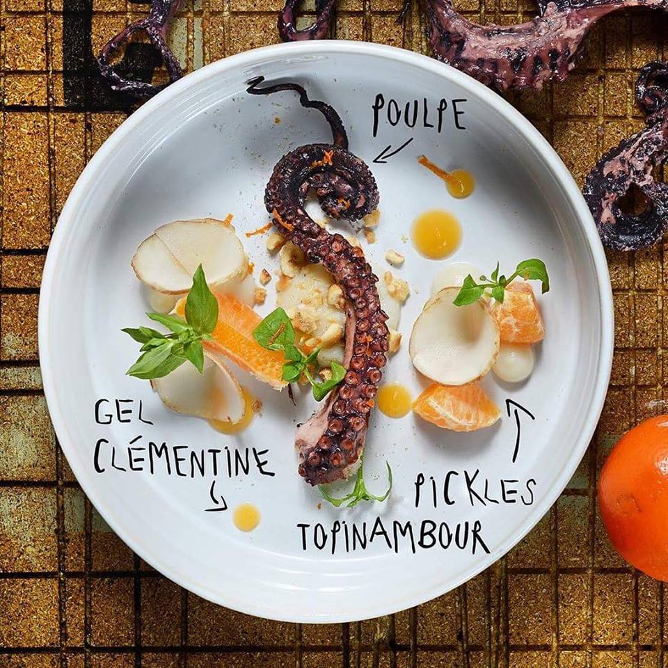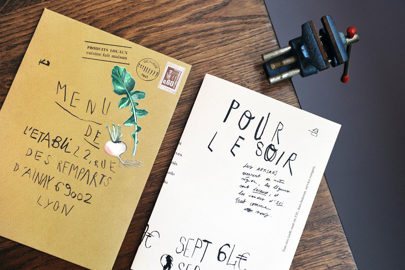 Pour correspondre au thème global, L’Etabli ne travaille qu’avec des artisans et producteurs de la région lyonnaise. Tout est local et responsable. Après avoir été salués par le chef en personne et avoir soigneusement sélectionné le couteau avec lequel nous allions manger, l’heure du choix est arrivée. La carte ne laisse pas place à la divagation : 2 entrées, 2 plats et 2 desserts au choix (qui changent évidemment très régulièrement). Comptez entre 24 et 64€ le menu, en fonction de votre fringale.