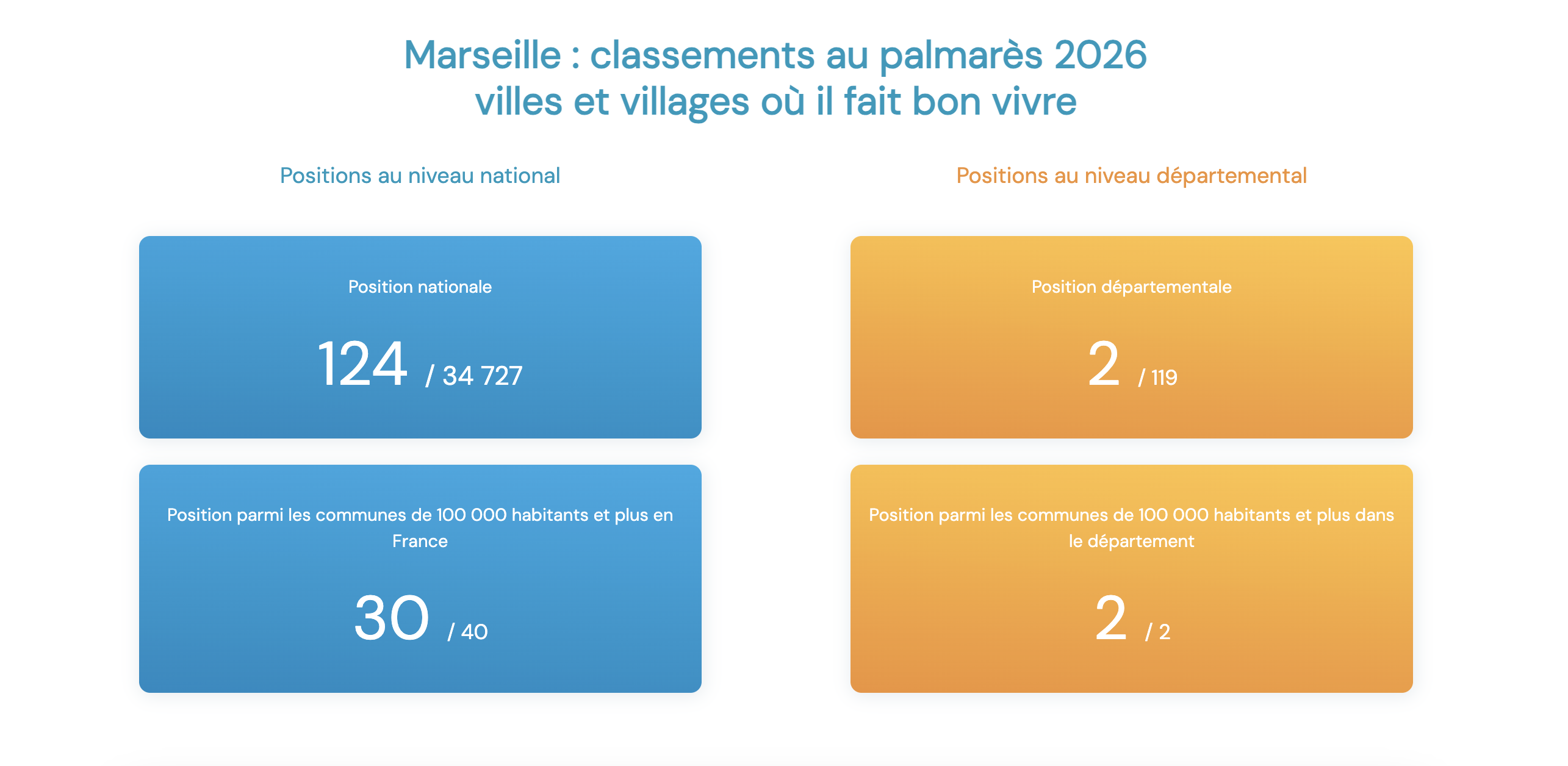 Du côté de Marseille, la situation apparaît plus nuancée. Dans les Bouches-du-Rhône, Aix-en-Provence conserve sa domination malgré un recul notable : classée 54ᵉ au niveau national en 2026, la ville « aux mille fontaines » perd huit places par rapport à 2024. Avant de céder totalement sa place de leader départemental, elle garde toutefois une avance confortable. Marseille, deuxième ville du département, se situe quant à elle à la 124ᵉ position, gagnant néanmoins trois places par rapport à l’année précédente. Parmi les grandes villes françaises, la cité phocéenne reste toutefois distancée. Nice, Brest, Rennes, Le Havre, Dijon, Strasbourg, Saint-Étienne, Toulon, Montpellier, Bordeaux, Nantes, Toulouse, Lyon et même Paris occupent une position plus élevée dans ce classement. Une situation qui illustre les défis persistants auxquels fait face la métropole marseillaise, entre attractivité, cadre de vie et attentes croissantes des habitants.