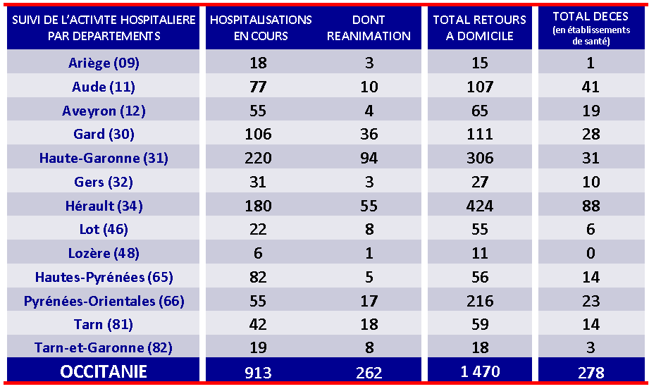Commençons par un bref état des lieux : à l'heure où sont bouclées ces lignes, 913 patients atteints de COVID-19 sont hospitalisés en Occitanie, dont 262 en réanimation/soins intensifs, selon l'Agence Régionale de la Santé. Au total, 278 décès dûs au Covid-19 ont été rapportés dans la région.