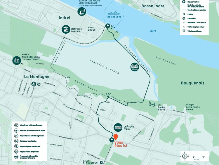 Pour vous rendre à cette belle balade de 1,5 km, il vous faut rejoindre le château d’Aux de La Montagne. Pendant le parcours, vous trouverez un belvédère avec un plan pédagogique, qui vous offrira une vue panoramique sur la Loire. Ensuite vous continuerez à longer le fleuve et à profiter des étendues de prairies humides qui mènent à Indret, le pont de la Roche-Ballue et le pont de la Rondeau, qui ont tous deux été restaurés. Puis vous traverserez un passage très sympathique aménagé en bois sur pilotis.
