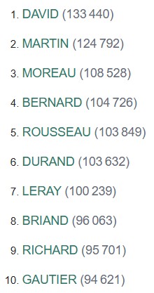 En Loire-Atlantique, un nom domine largement le classement : "David". Avec plus de 133 440 occurrences recensées à date sur 500 ans, il arrive en tête, loin devant ses poursuivants. Derrière lui, "Martin" (124 792) et "Moreau" (108 528) complètent le podium départemental. Des noms qui sentent bon le terroir et qui résonnent particulièrement dans la région nantaise.