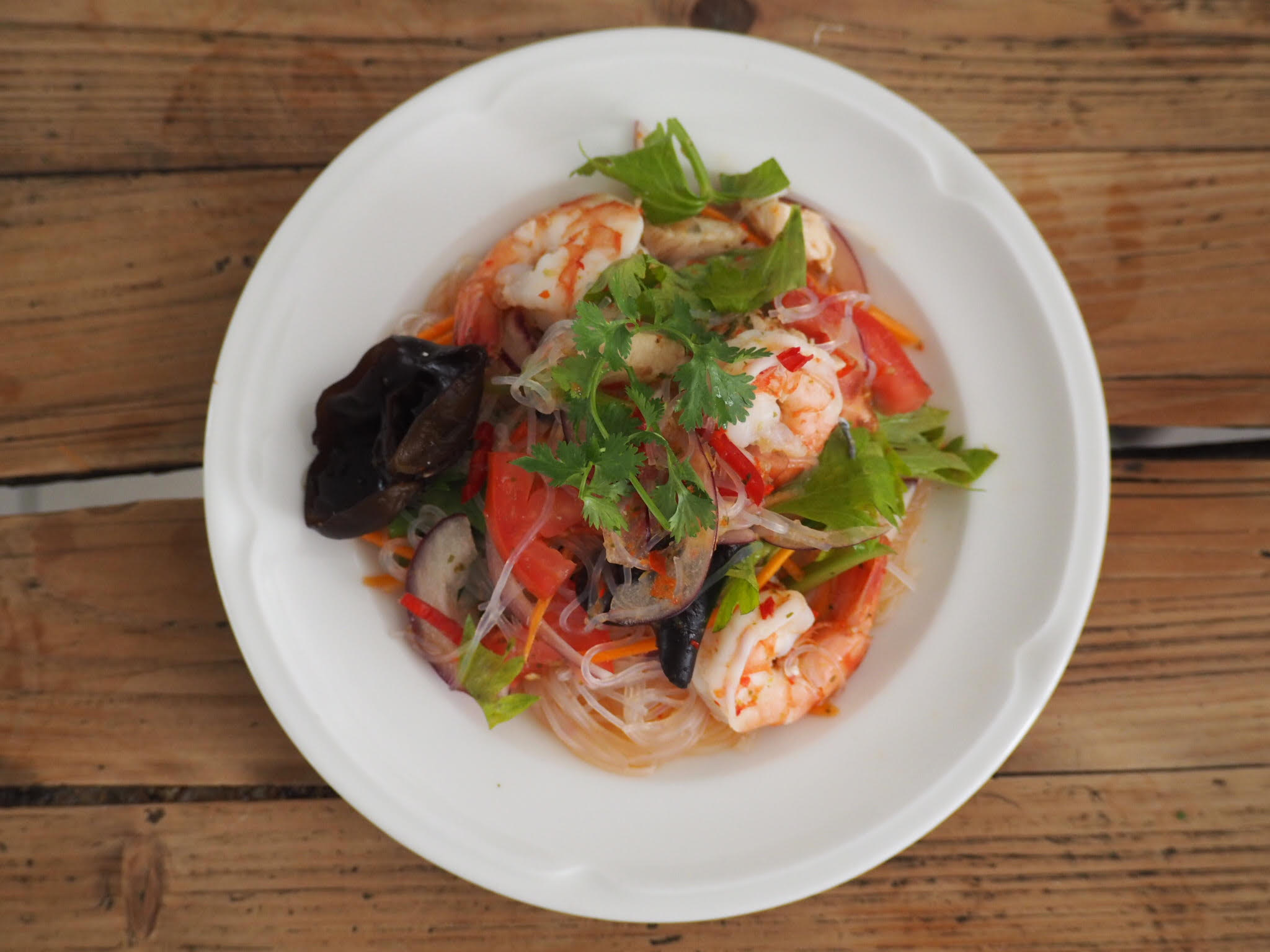 Alors que ma comparse opte pour un Yam Woun Sen (des vermicelles de riz assortis de crevettes, d’échalotes frites, de cacahuètes pilées et d’herbe fraîche), mon estomac me guide vers ce gargantuesque bo-bun qui mêle menthe, pousses de soja, vermicelles de riz, nems aux légumes, oignons, choux, carottes, cacahuètes pilées et ciboulette, le tout arrosé de bouillon maison.