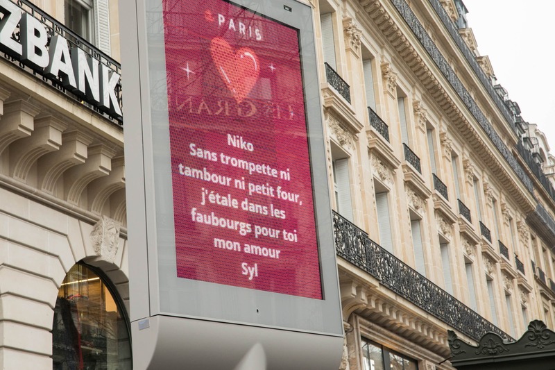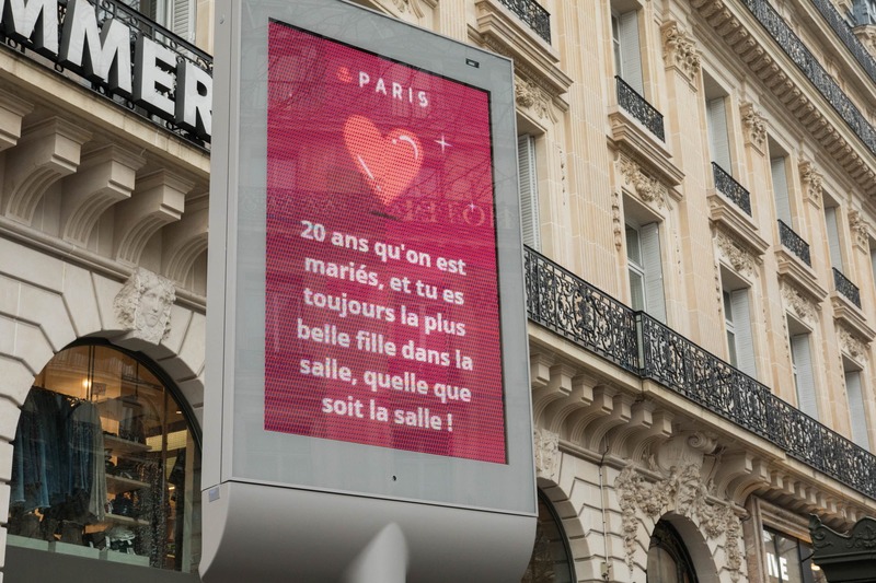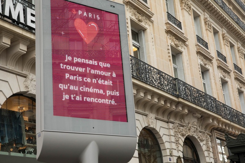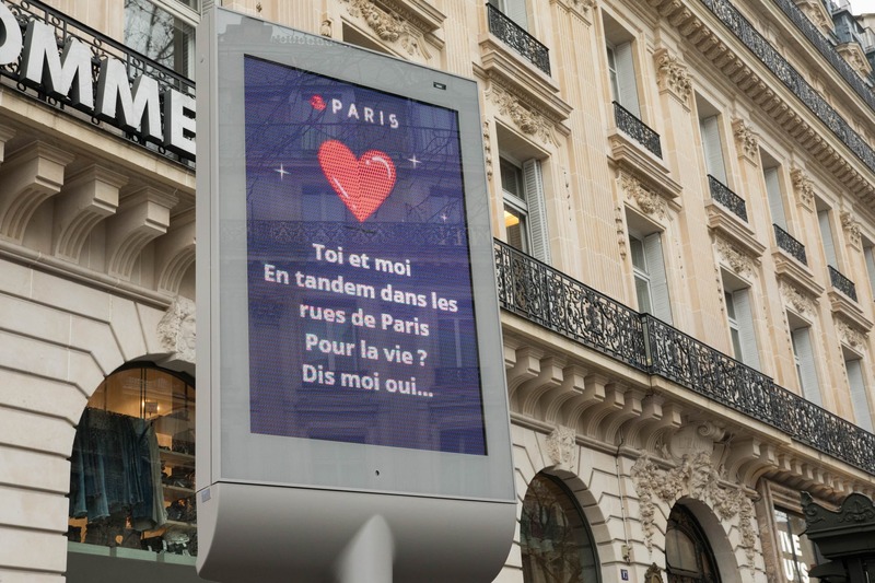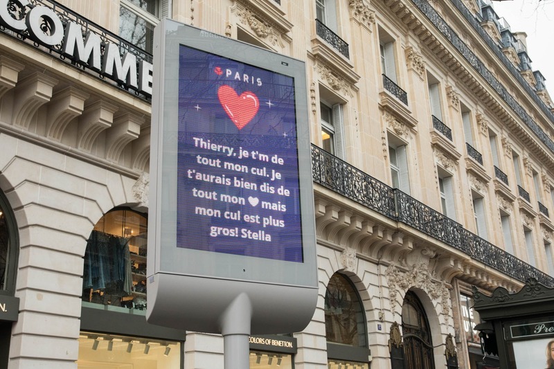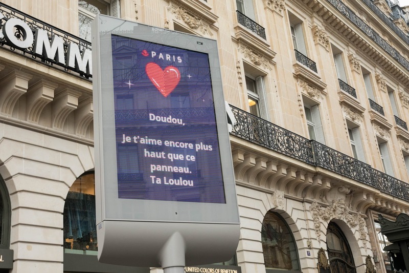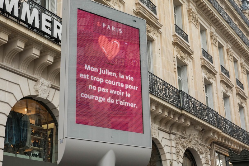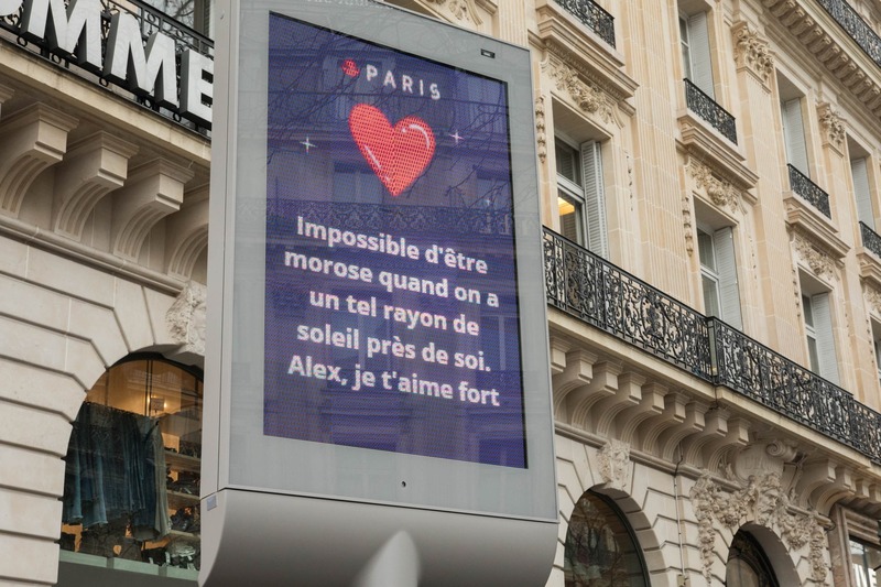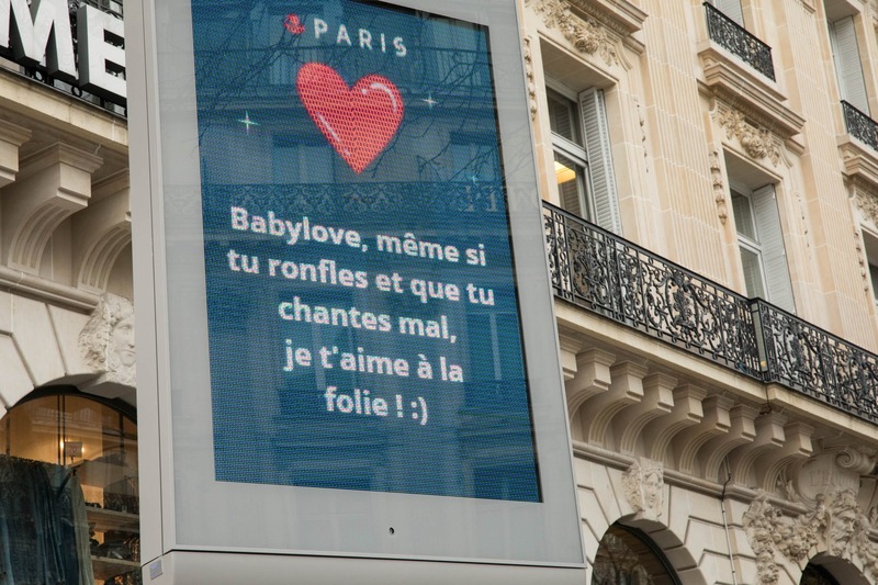 « Quand je suis seule et que je peux rêver, je rêve que je suis dans tes bras, je rêve que je te fais tout bas, une déclaration ». La Déclaration d'amour, certainement l'une des plus belles chansons d'amour, écrite en 1974 par Michel Berger pour une certaine France Gall. Mais vous n'avez pas à rougir, non. Vous aussi vous avez de la prose à revendre. Hier, 14 février, la Mairie de Paris diffusait sur 157 panneaux lumineux vos doux élans d'amour dans le cadre de leur opération "Vos mots d'amour s'affichent dans tout Paris". Demandes en mariage, ode à Paris, messages cryptés et poèmes du bitume : vous avez été bon les gars. Cœur sur vous.