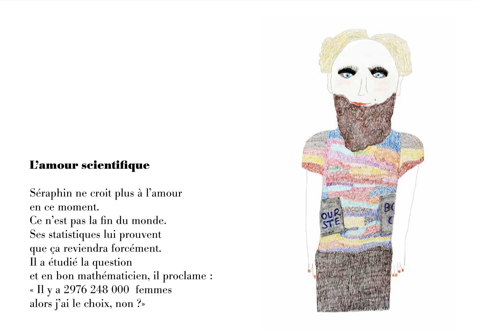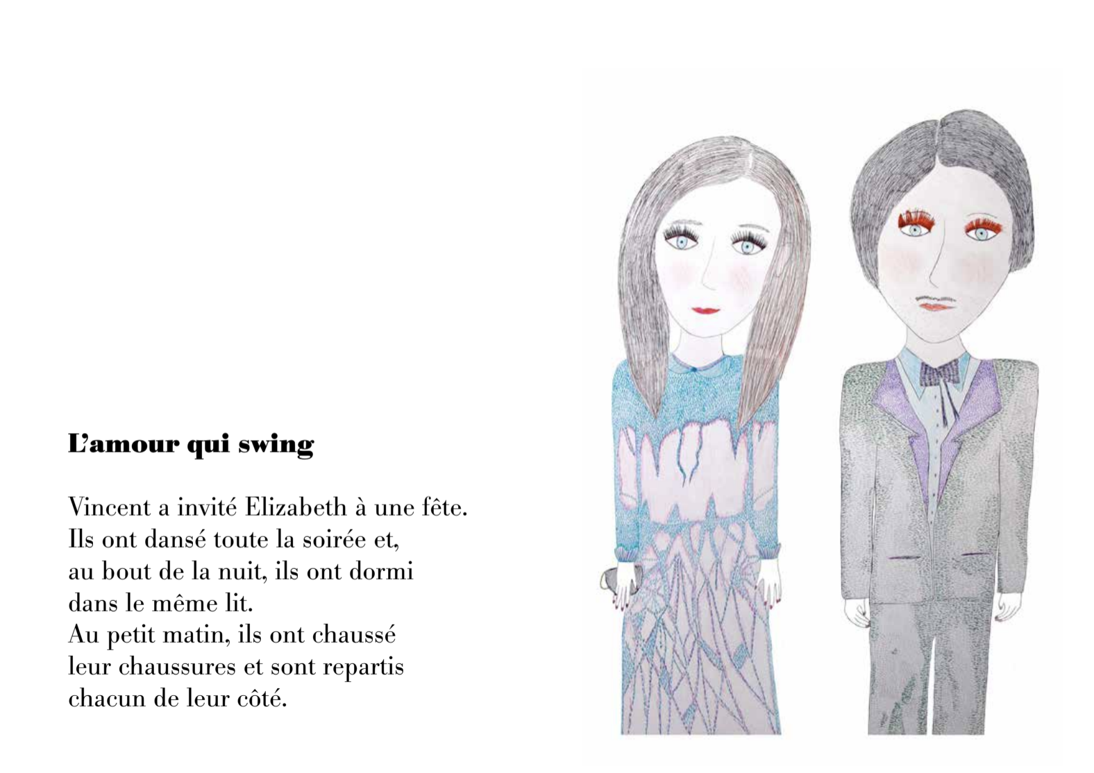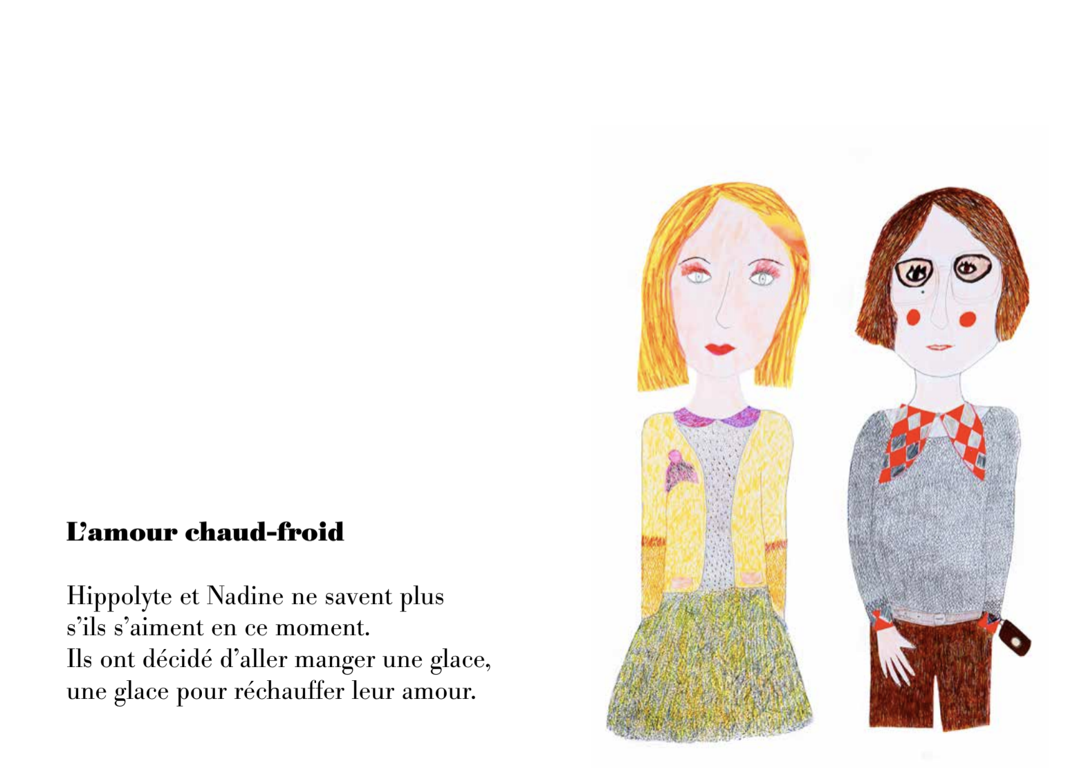 Hippolyte et Nadine mangent une glace pour réchauffer leur amour, David offre une glace à sa femme tous les samedis depuis 20 ans, Séraphin, mathématicien, calcule combien de femmes il pourra rencontrer : tous les portraits tracés au trait à la fois ingénu et original d'Aurélia exprime une tendre bienveillance envers ces infinies alternatives amoureuses. Elle « recrée un instant grâce à son crayon, réinvente le monde qu'elle voit ». On ressent aussi à travers le regard d'Aurélia Alcais sa passion pour la mode : « les vêtements, accessoires, maquillage ou coiffures disent quelque chose de quelqu'un. C'est déjà une histoire. » Et puis il y a ce couple qui passe sa vie sur son téléphone, cette femme qui aime un homme plus jeune, une autre qui aime ses chiens, et puis celle qui veut trouver son Peter Pan... « Je voulais regarder l'autre sans jugement parce que c'est aussi une partie de nous. On a tous des incohérences, des contradictions permanentes, et nous vivons avec nos absurdités. »