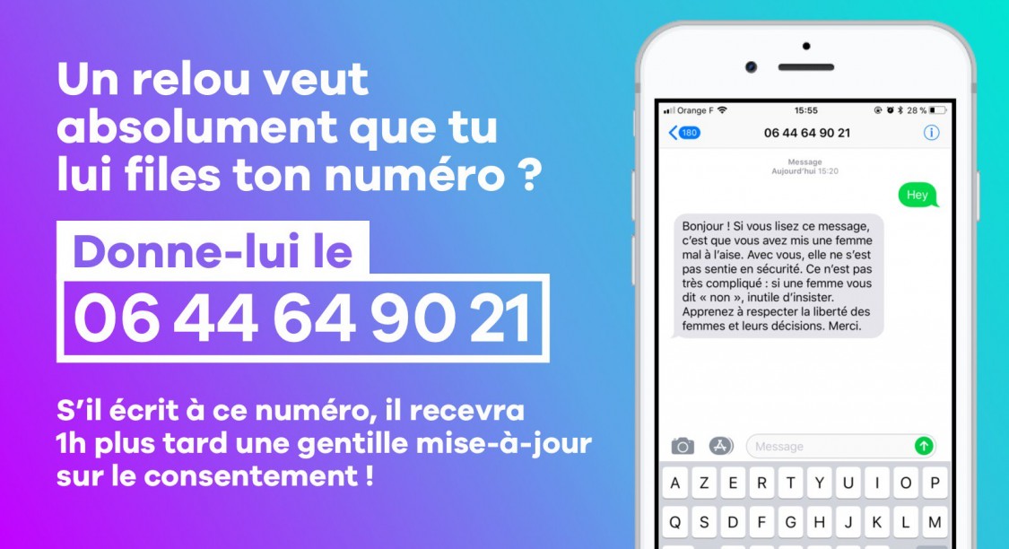 Traduction : « Oh, bonjour. Si vous recevez ce message, c'est qu'à cause de vous, une femme s'est sentie en insécurité ou sujette à un manque de respect. Sachez que "non" est une réponse à prendre en compte et respectez s'il vous plaît la capacité émotionnelle et physique des femmes à prendre une décision. Merci. »