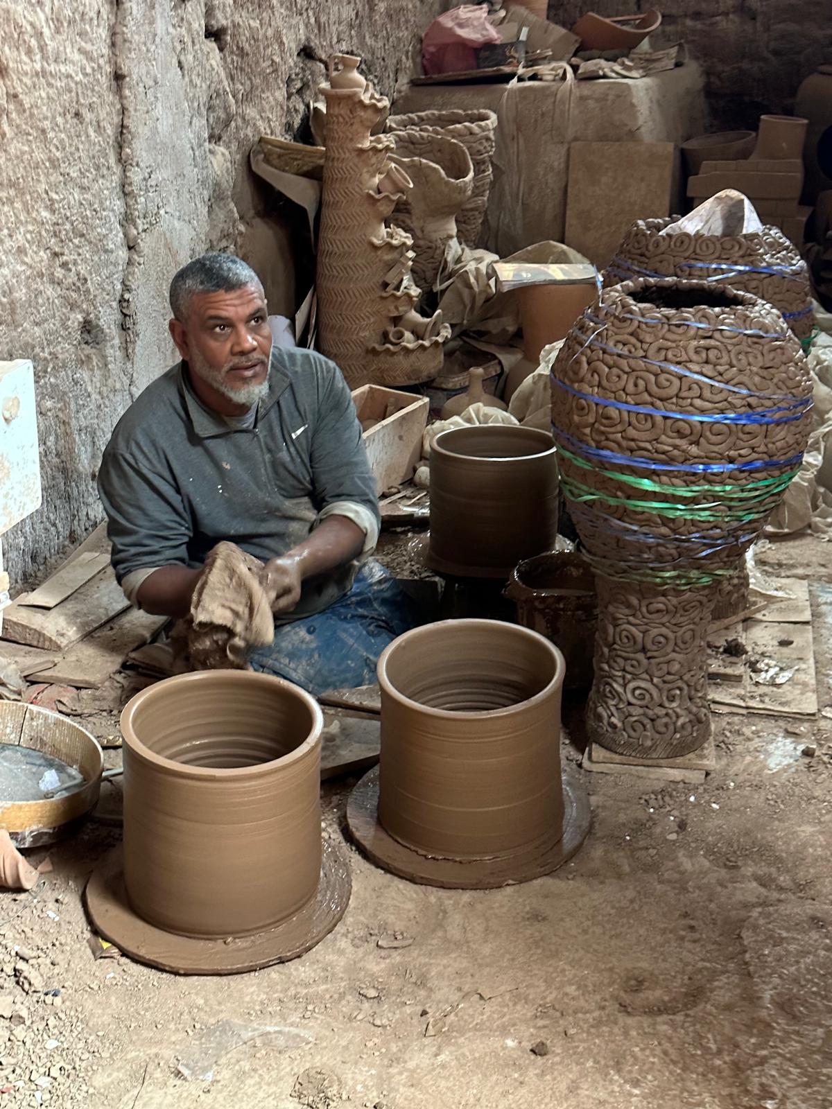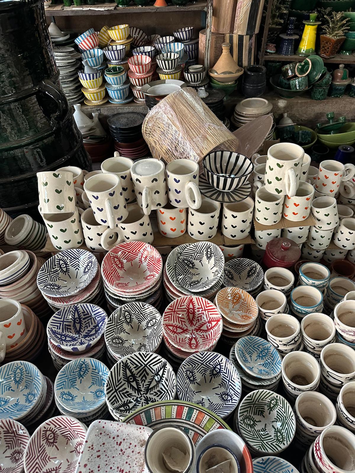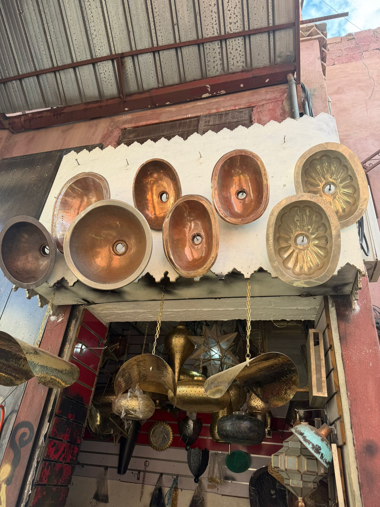Au cœur du souk Errabii Bab Ghemat à Marrakech, nous sommes tombés sur une échoppe incontournable : Fer, Poterie d’Or Zaouaq. Derrière ce nom, l’artisan Abdessamad, maître du tadelakt, du zellige et de la poterie traditionnelle. Ici, les étagères débordent de vases, plats, jarres et pièces façonnées à la main, un joyeux mélange de couleurs, de textures et de savoir-faire brut. C’est l’endroit parfait pour dénicher une pièce unique ou commander du sur-mesure directement auprès de l’artisan.