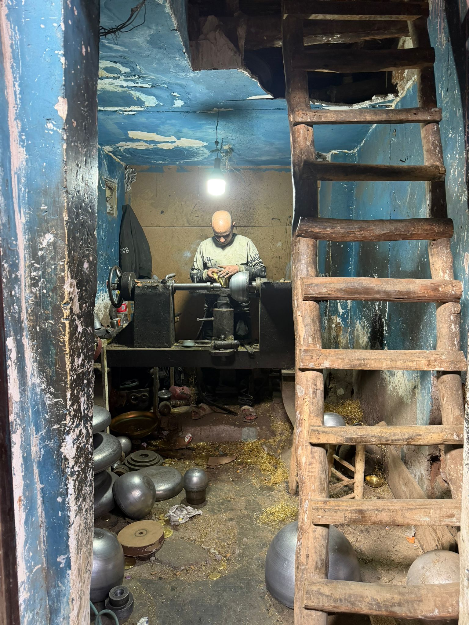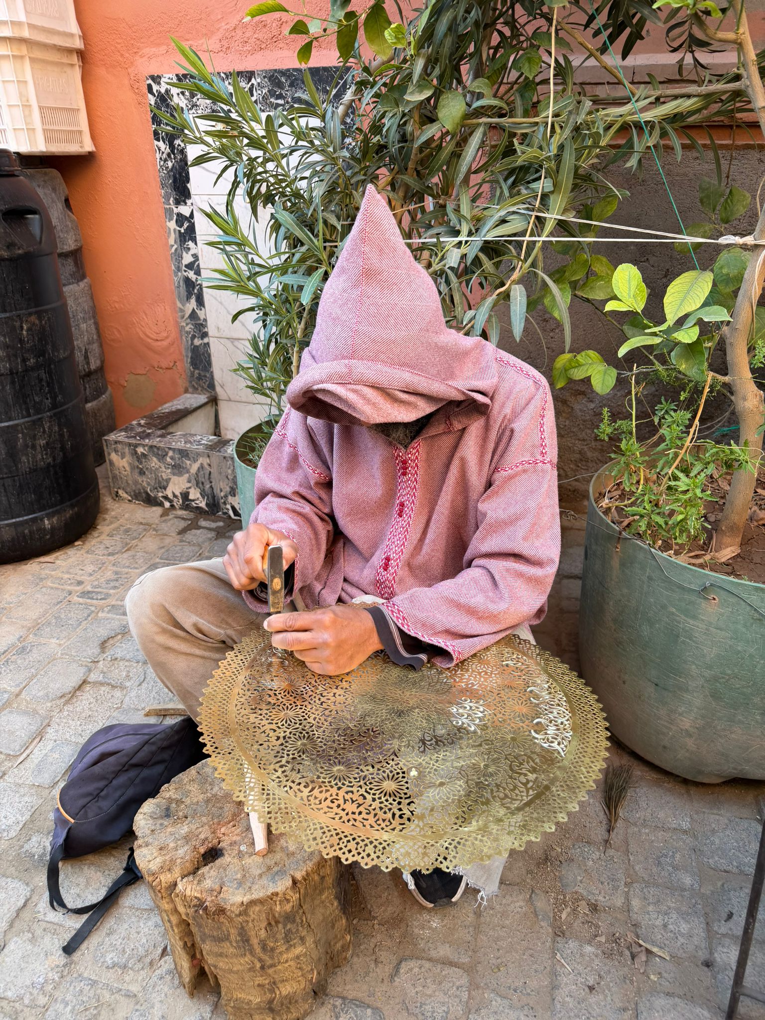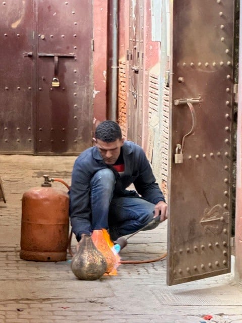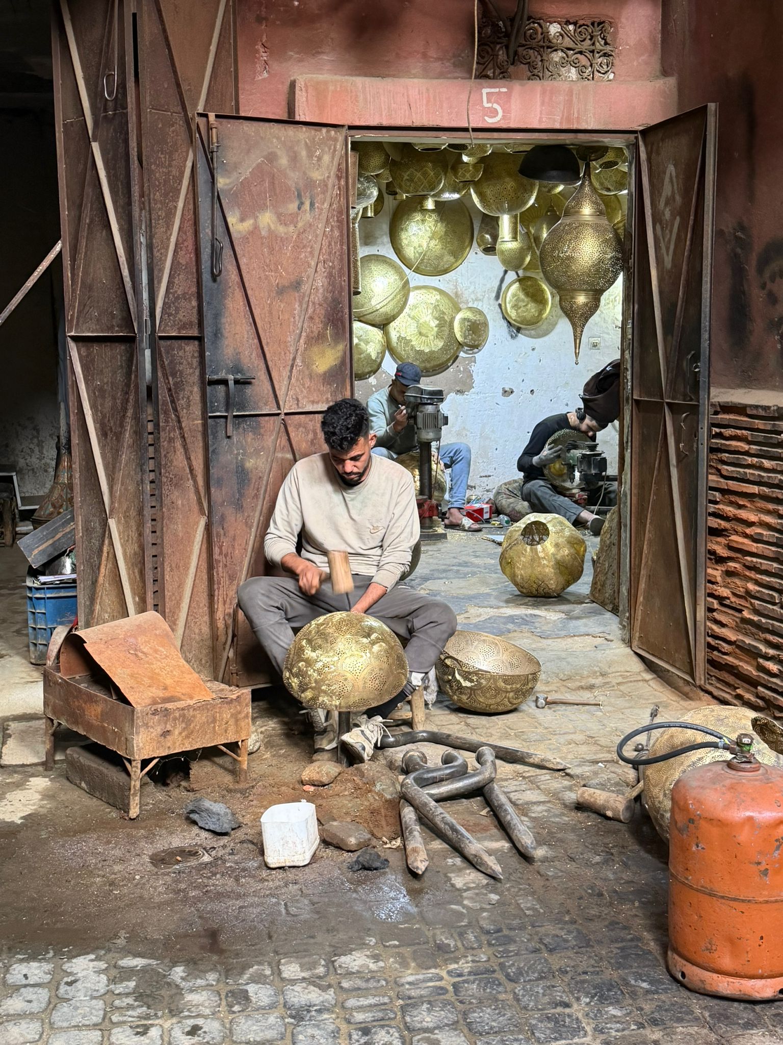 À l’entrée de l’atelier, le laiton se martèle à ciel ouvert, perpétuant un savoir-faire ancestral au cœur du souk.©Jacques de la Chaise