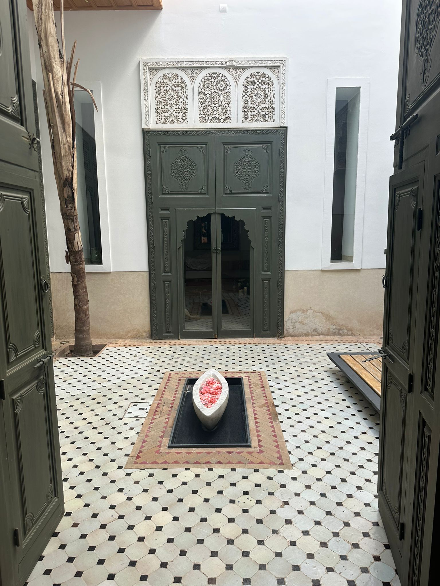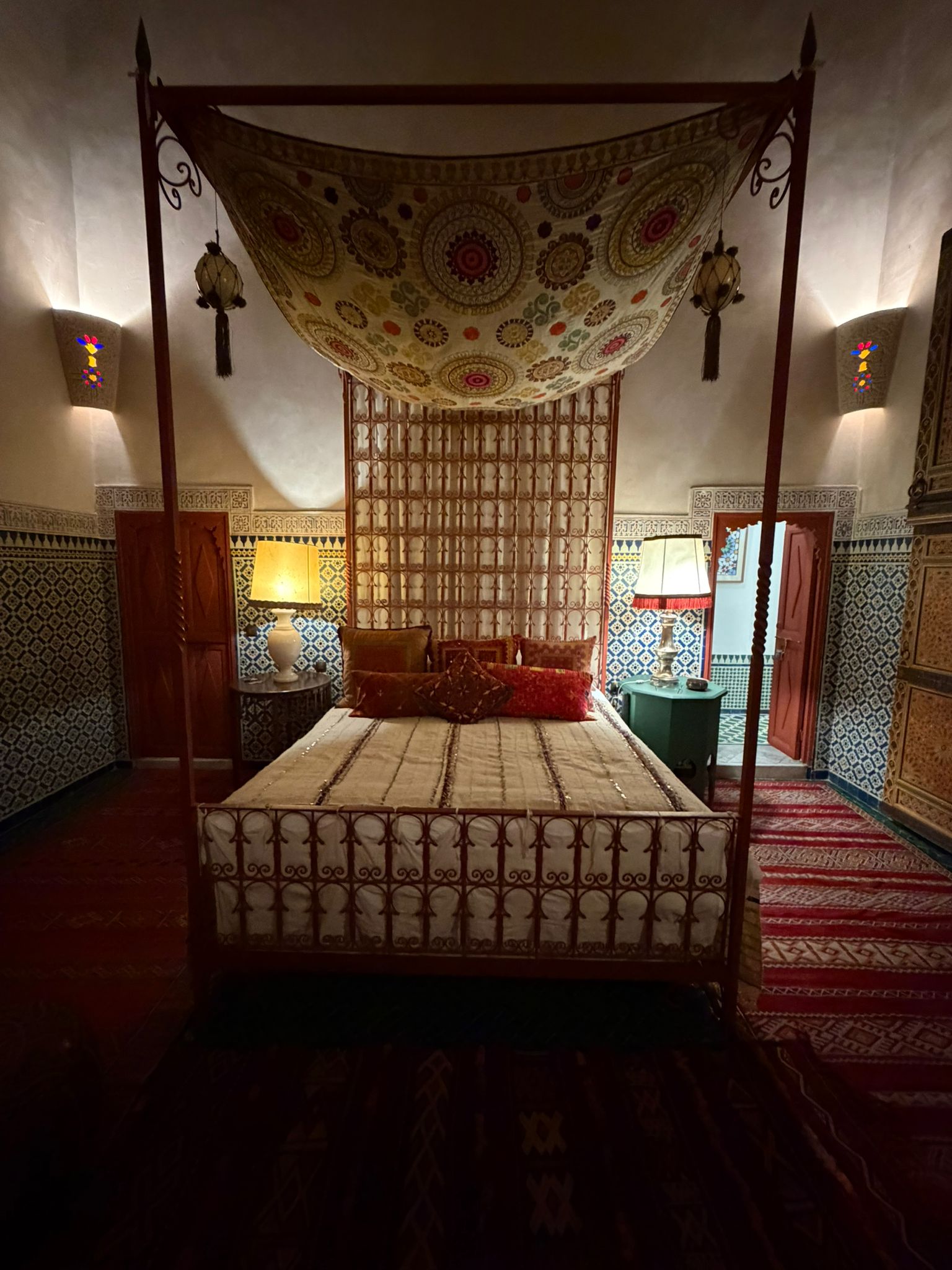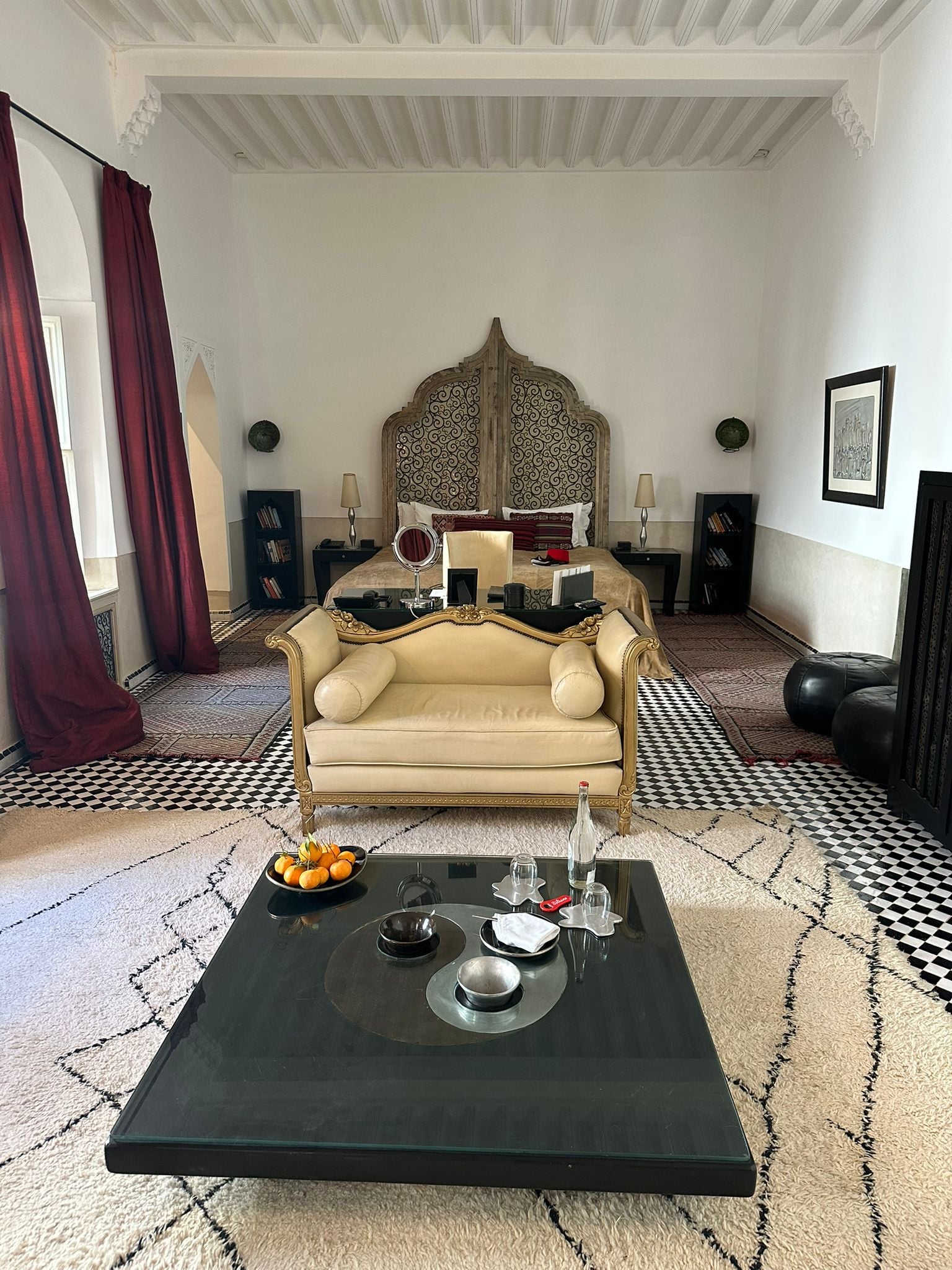 Après l’effervescence, place à la douceur. Le Riad Farnatchi est de ces adresses qui coupent le souffle dès l’entrée. Restauré avec un soin maniaque, rempli d’antiquités marocaines et européennes, le lieu est un labyrinthe de patios, terrasses, étages, et salons à cheminée. Les suites sont de véritables appartements, vastes, calmes, lumineux, habités par une esthétique qui mélange tradition et chic intemporel. Chaque détail est pensé : portes anciennes sculptées, draperies épaisses, carrelages précieux. À votre arrivée, la cheminée est allumée : un geste simple mais profondément accueillant.