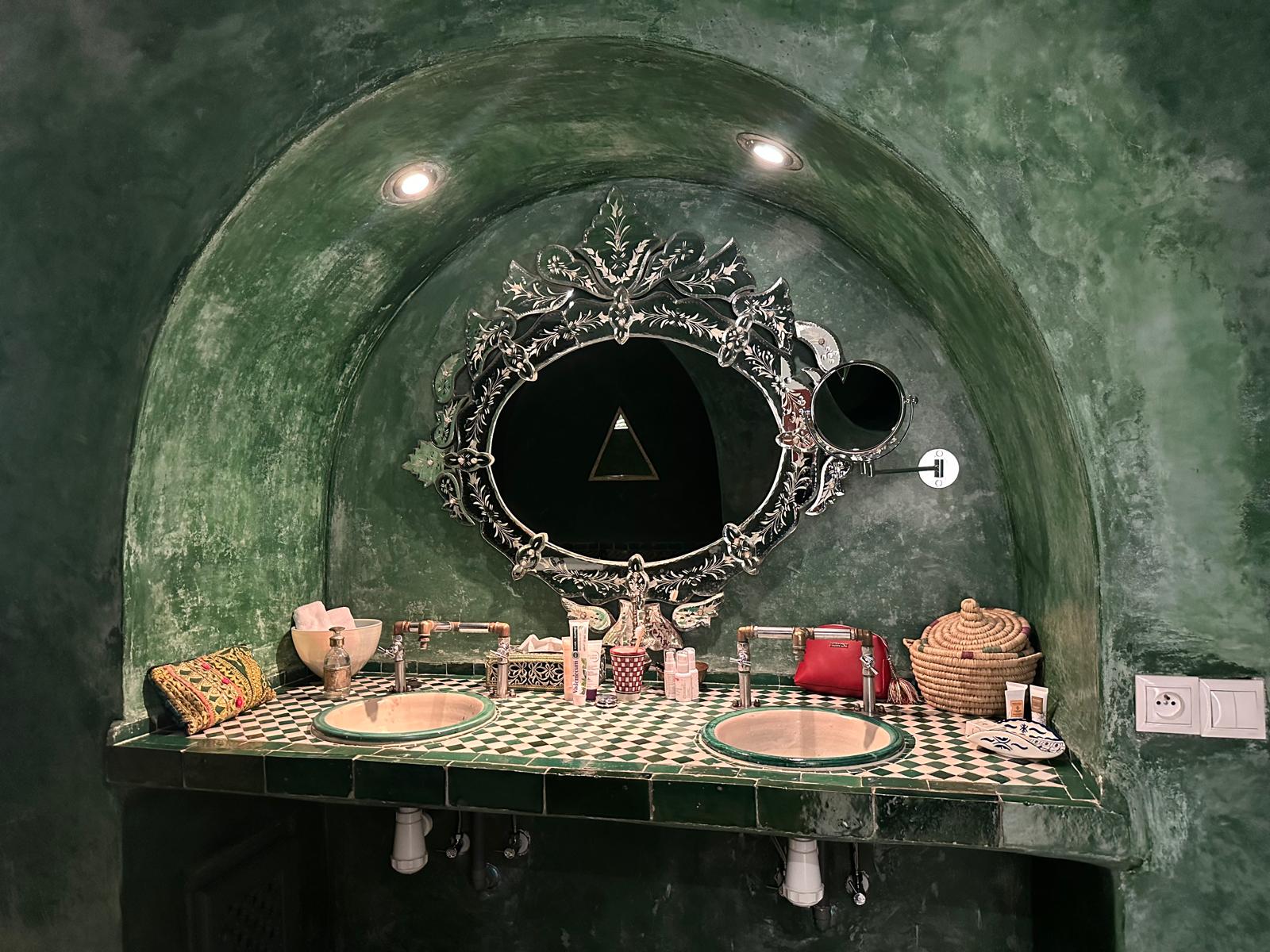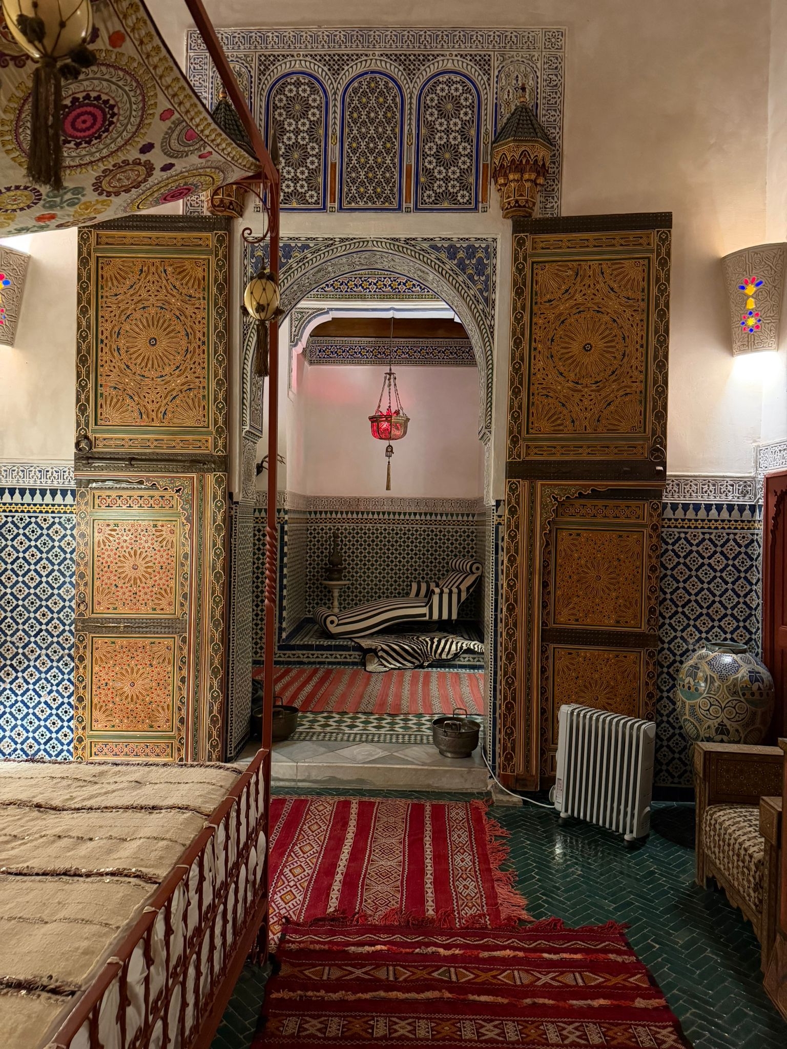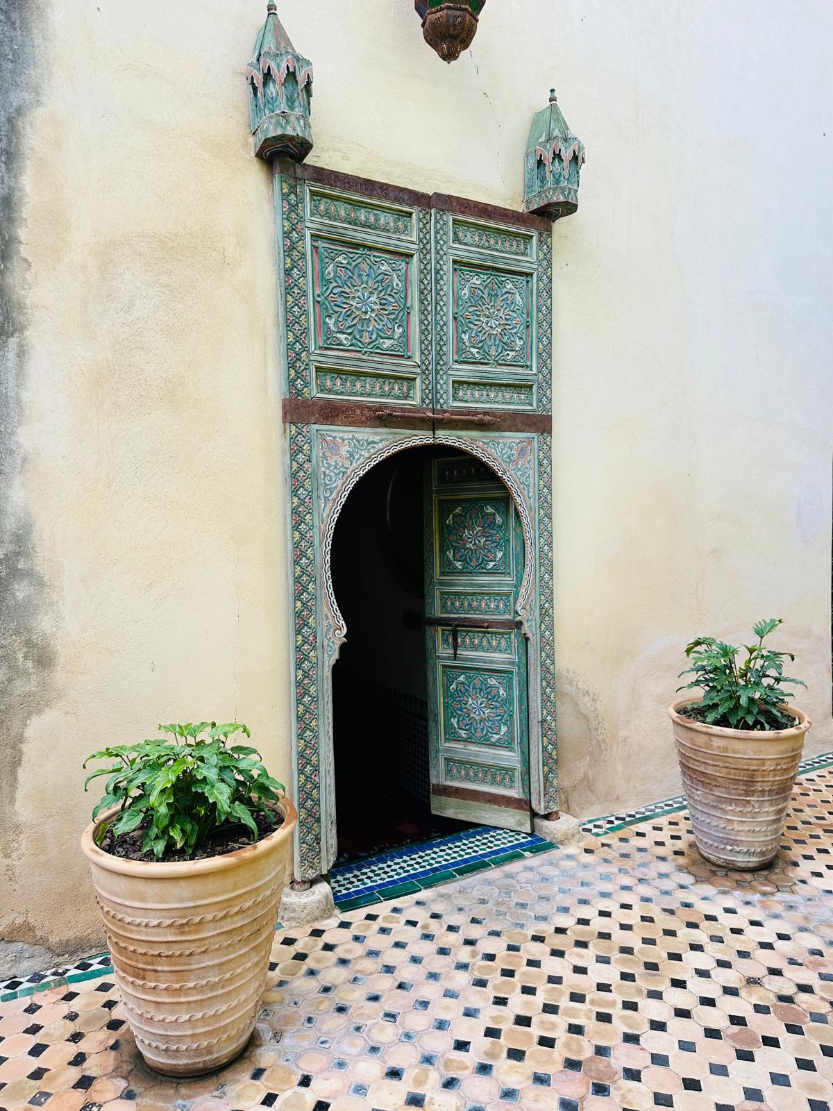Après l’effervescence, place à la douceur. Le Riad Farnatchi est de ces adresses qui coupent le souffle dès l’entrée. Restauré avec un soin maniaque, rempli d’antiquités marocaines et européennes, le lieu est un labyrinthe de patios, terrasses, étages, et salons à cheminée. Les suites sont de véritables appartements, vastes, calmes, lumineux, habités par une esthétique qui mélange tradition et chic intemporel. Chaque détail est pensé : portes anciennes sculptées, draperies épaisses, carrelages précieux. À votre arrivée, la cheminée est allumée : un geste simple mais profondément accueillant.