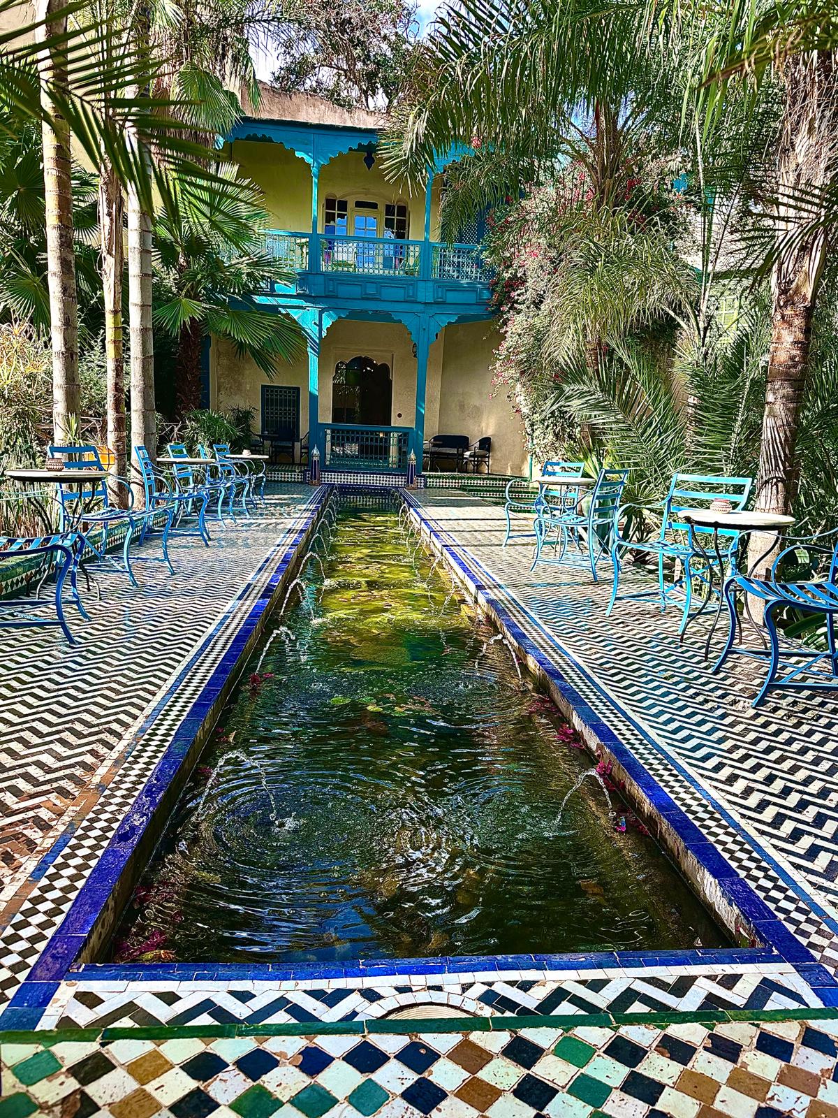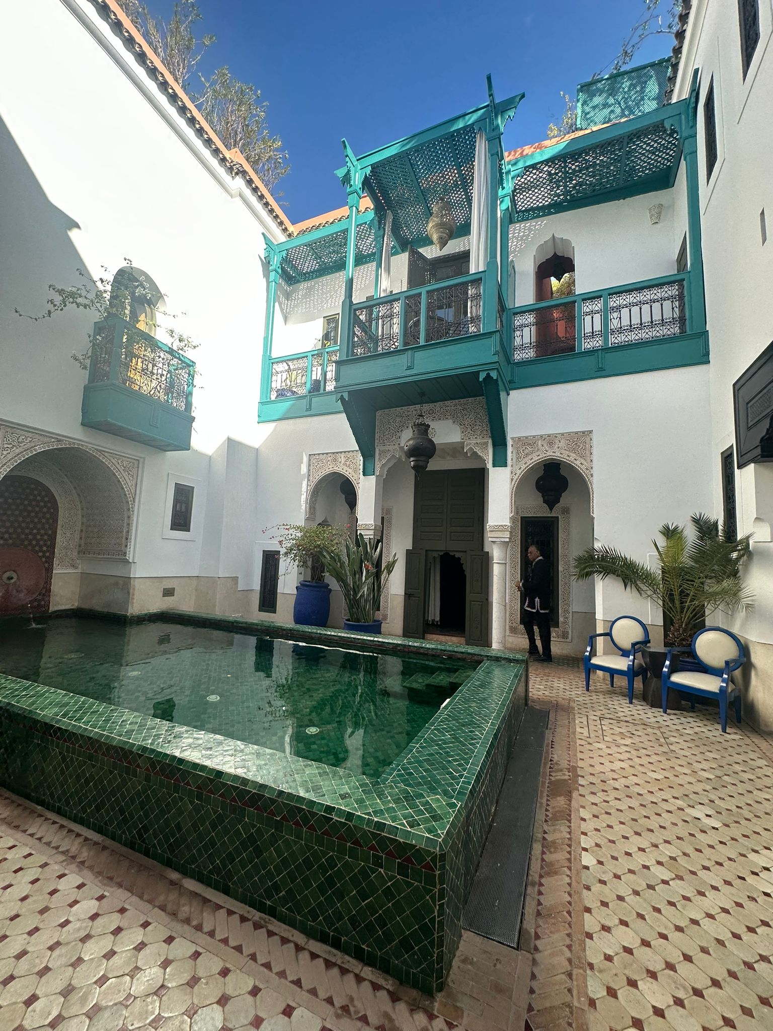 Un riad grandiose entre zelliges, bassin central et balcons turquoise. ©Jacques de la Chaise
