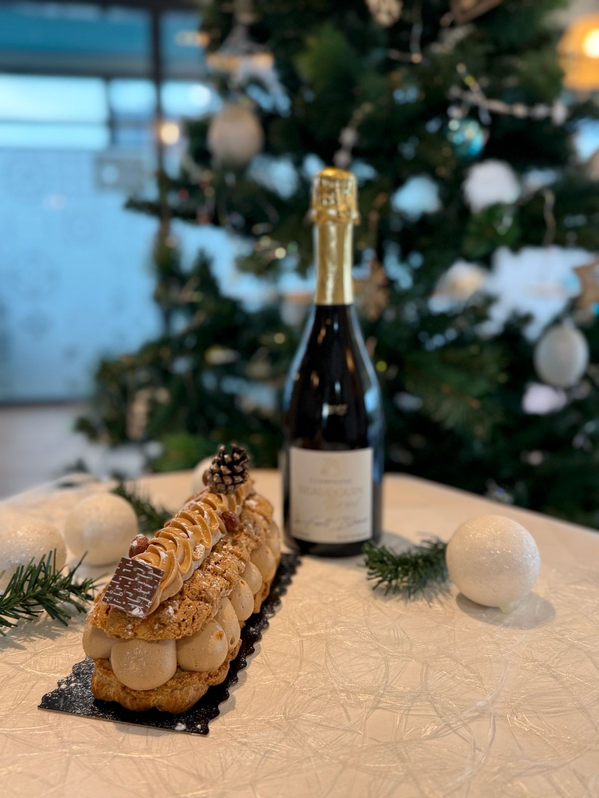 Pour Noël, Le Macaron Bleu à Bezannes nous concocte un classique revisité en dessert de fêtes : la bûche Paris-Brest, composée de pâte à choux, crème mousseline praliné et noisettes torréfiées. Une création qui ravira à coup sûr nos palais, avec un secret bien gardé pour rendre la pâte à choux subtilement chocolatée et croquante !