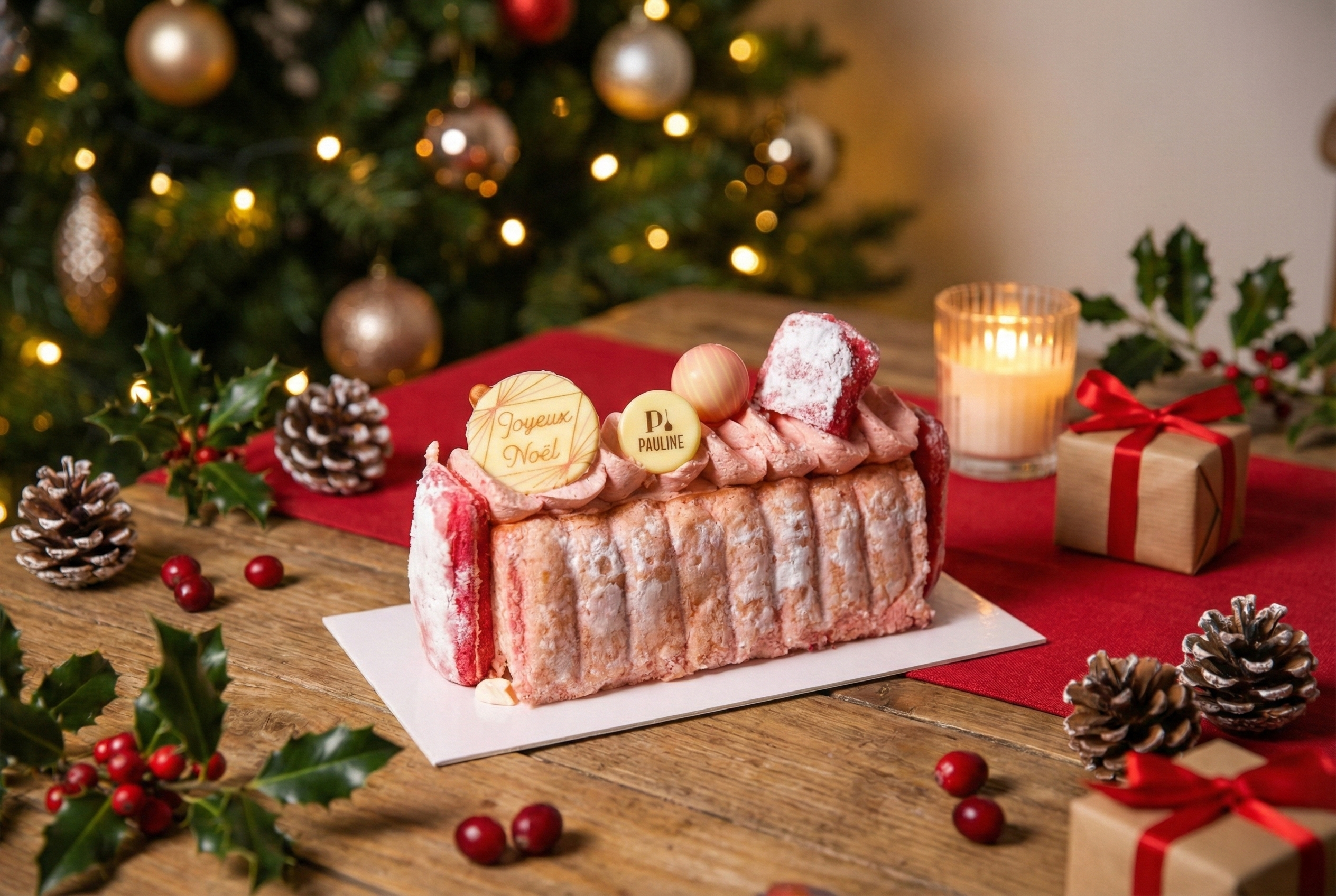 La plus rémoise de toutes les bûches sans aucun doute, puisque le fameux biscuit rose est l’ingrédient souverain de ce dessert de Noël ! Les biscuits roses, moelleux et faits maison, sont accompagnés d’une mousseline vanille et biscuit rose ultra fondante, ainsi que de framboises.