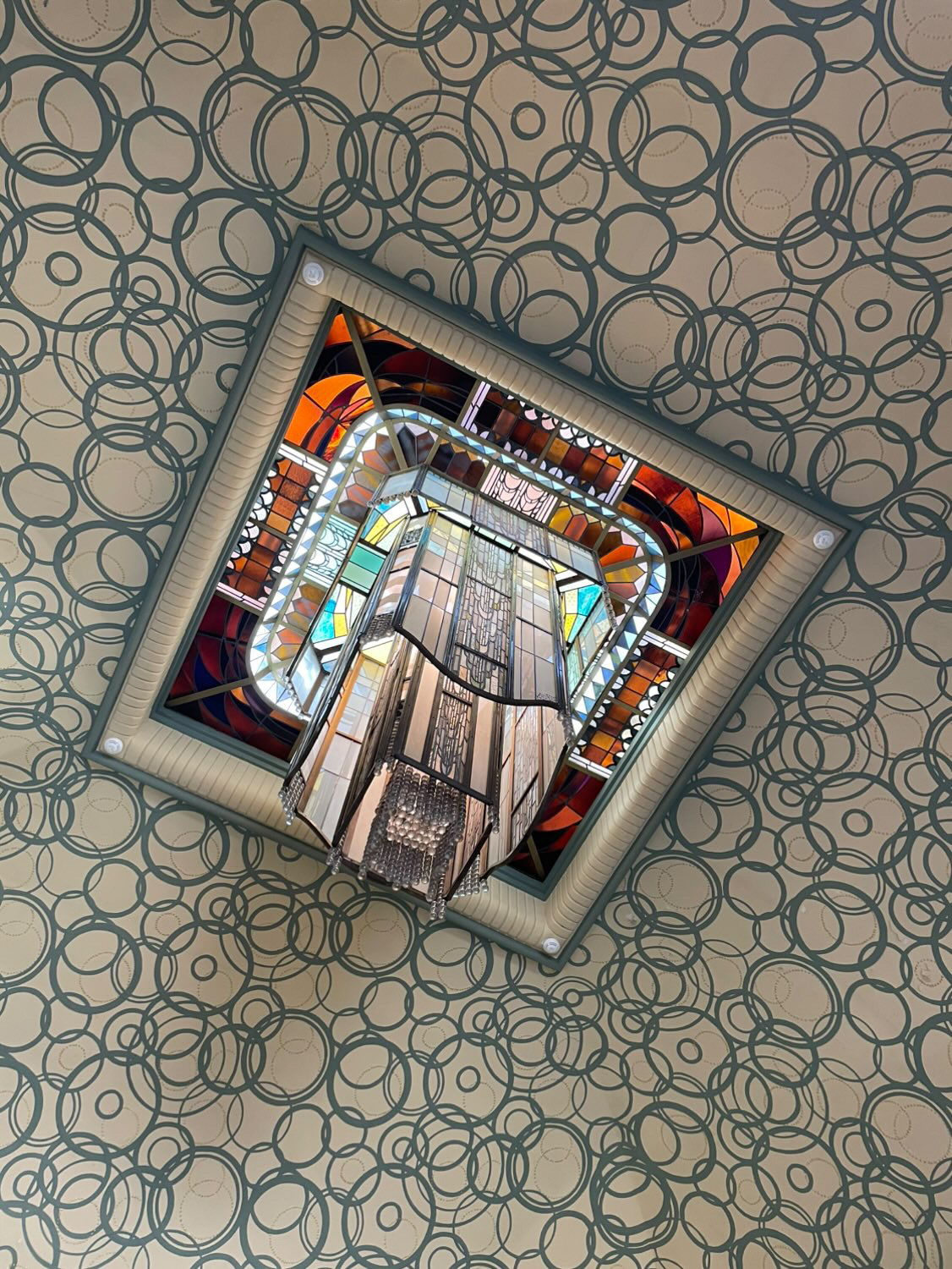 Ce véritable bijou architectural regorge d’ouvrages d’art, comme le magnifique lustre en pendentif qui incarne parfaitement l’art du vitrail de l’époque, dans le hall de la bibliothèque. Réalisé par Jacques Simon et son atelier Simon-Marq, ce puits de lumière symbolise l’entrée de la connaissance dans l’édifice.