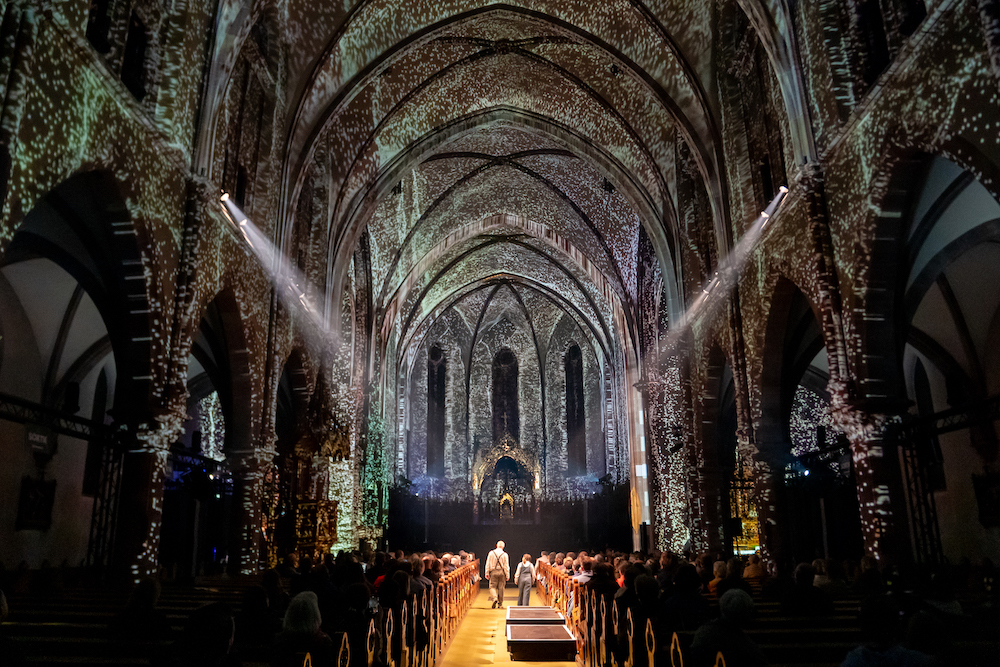 Nef, voûtes… chaque recoin de l’église Saint-Paul est investi de lumière. Ce spectacle, mis en scène par Damien Fontaine, métamorphose les murs en pierre, d’ordinaires figés, pour en faire un terrain de créativité sans limite, coloré et en mouvement.