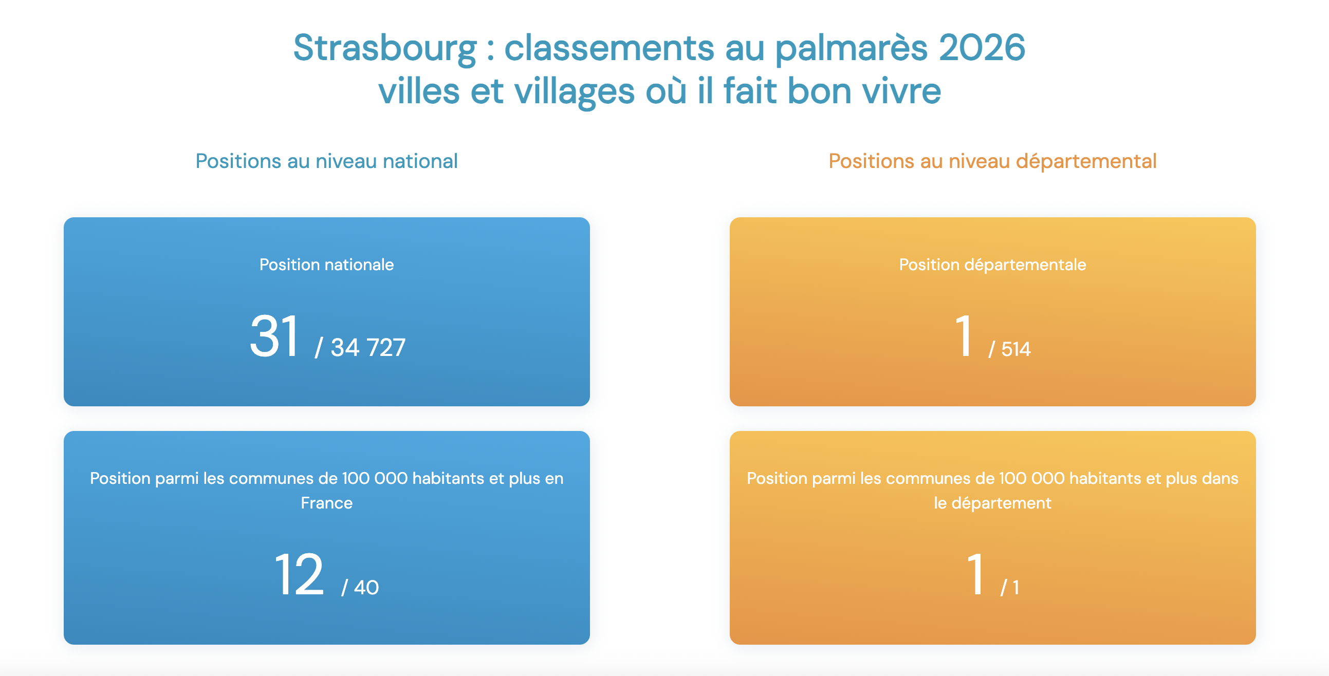 Du côté de Strasbourg, la situation apparaît plus nuancée. Dans le département, elle reste la ville la plus appréciée. Parmi les grandes villes françaises, Strasbourg reste toutefois légèrement distancée malgré une belle 31e place.