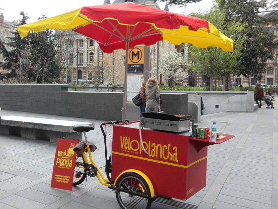 Les sorties de métro mais aussi la sortie de la Bibliothèque Universitaire de l’Université de Toulouse Capitole 1 sont les rendez-vous pris par Vélo plancha pour nourrir et hydrater les toulousains ! Tu le sais mieux que quiconque, on travaille mieux le ventre plein ! L’originalité de ce triporteur est que toute la cuisine est faite à la plancha. Si, on t'assure que c'est possible et en plus c'est super bon !