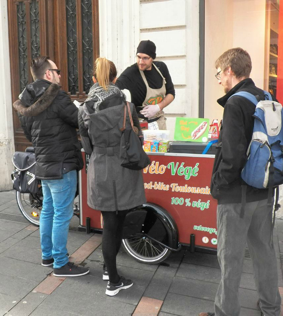 Ton ami vegan va être content : vélo végé est le triporteur human friendly ! William te propopose un hot dog végé suivi d’un cookie ou d’un munffin végé aussi. Etant très mobile dans la ville, n’hésite pas à suivre sa page Facebook pour savoir où il est, généralement il se situe non loin d’une station de métro ou de tram !