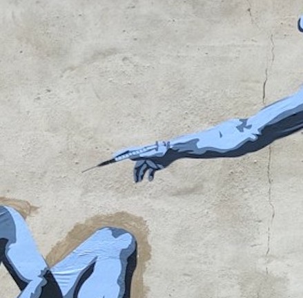 Une oeuvre réalisée par le street-artiste Lug qui a souhaité envoyer un message clair aux anti-vaccins. « L'idée d'origine est de détourner une œuvre bien connue, une œuvre universelle pour rendre à la vaccination son universalité, précise l’artiste à nos confrères de la Voix du Midi. Le choix de l'œuvre, bien que théologique et d'appartenance chrétienne, n'a pas de lien direct avec la religion, si ce n'est cette idée de "croyance". Cette œuvre, directement inspirée d'un peintre bien connu de tous, reflète le malaise ambiant autour du Covid et des réfractaires à la vaccination : se vacciner ne devrait pas relever d'un choix basé sur une croyance. »