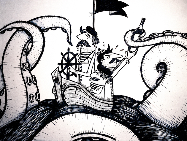 On monte à bord, sur le pont d'abord... Une chaleureuse pièce en bois, cuivre et béton ciré, au design soigné et épuré, à la lumière tamisée menant à la cale, lieu propice à la discussion et la dégustation. Et en toile de fond, une fresque réalisée par Monika des Trois Pinardiers affrontant les tempêtes, écumant les mers à la recherche de breuvages extraordinaires...