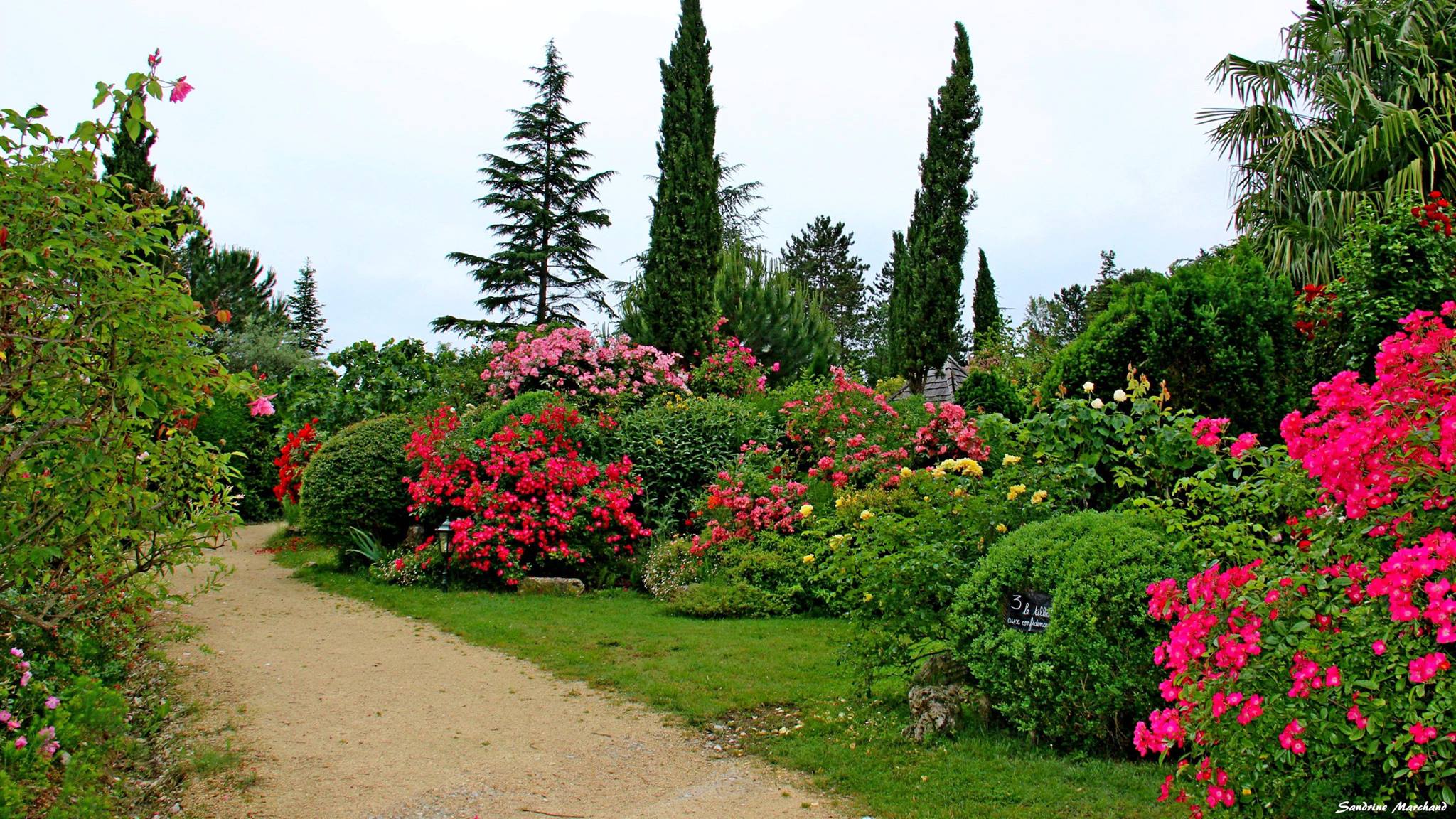 Sans oublier les nombreux cyprès de Provence qui ponctuent le jardin et contribuent, avec des palmiers et autres plantes méditerranéennes, souvent très parfumées, à donner au jardin un caractère méridional. Des graminées et de nombreuses plantes à feuillage gris, adaptées au terrain sec, se mêlent à plus de 700 rosiers, anciens et modernes, qui font du jardin l'une des plus grandes roseraies de France.