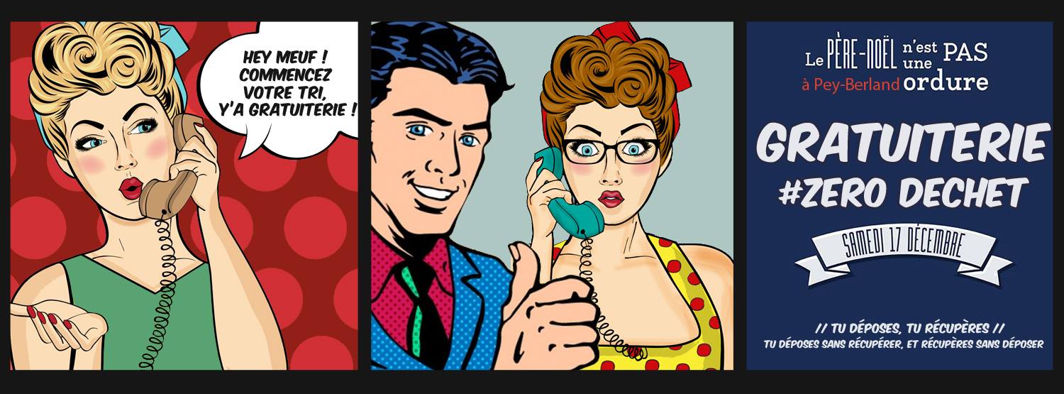 A tous les fans du troc, des vides-greniers, du vintage. A tous les écolos’, les engagés, les pinces, les « DIY ». A tous les passants et les curieux … Le 17 décembre à Pey Berland, venez avec votre cabas, c’est l’heure de la gratuité ! A l’occasion de l’évènement « Le Père Noel n’est pas une ordure », co-organisé par les associations Surfrider, Les Jeunes Ecologistes de Bordeaux Aquitaine, une belle gratuiterie (entre autre) s'installera sur la place. Le but : sensibiliser aux déchets et nos consommations. Avant de jeter et polluer, on peut recycler, échanger et même donner ! Le concept est donc simple : tu déposes, tu récupères. Tu déposes sans récupérer, et récupères sans déposer !