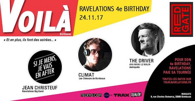 Pour ses 4 ans, Ravelations paye sa tournée. Après Paris et Toulouse, ils seront ce soir à Bordeaux, au Redgate. Au programme des Dj sets de The Driver, Climat et Jean Christeuf. Bref, une vraie nuit techno pour te réchauffer et régurgiter ton vin chaud !