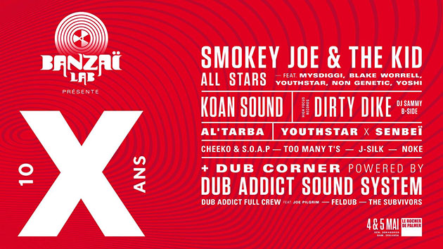 Smokey Joe & The Kid, Al’Tarba, L’Entourloop, Senbeï ou encore Too Many T’s, ça vous parle ? Ces groupes qu’on adore ont un point commun : Banzaï Lab. Depuis maintenant 10 ans, ce laboratoire de création musicale made in Bordeaux s’affaire à enchaîner les albums et EPs pour de nombreux artistes talentueux qu'ils nous font découvrir lors des meilleurs events bordelais. 10 années de progression, de succès et de découvertes que l’organisation se devait de fêter. Hip-Hop, Electro et Dub et ce, pendant DEUX JOURS . Autant dire que ça va groover comme jamais.