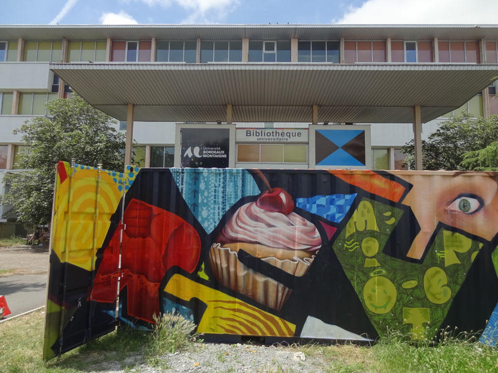 Voilà de quoi redonner le sourire à nos étudiants bordelais! Grâce à l'Opération Campus Bordeaux, les façades austères de la B.U de Montaigne Montesquieu sont désormais émaillées de fresques colorées. Dans le cadre du projet Station Campus, le street art a trouvé une place de choix à la fac. Fun !