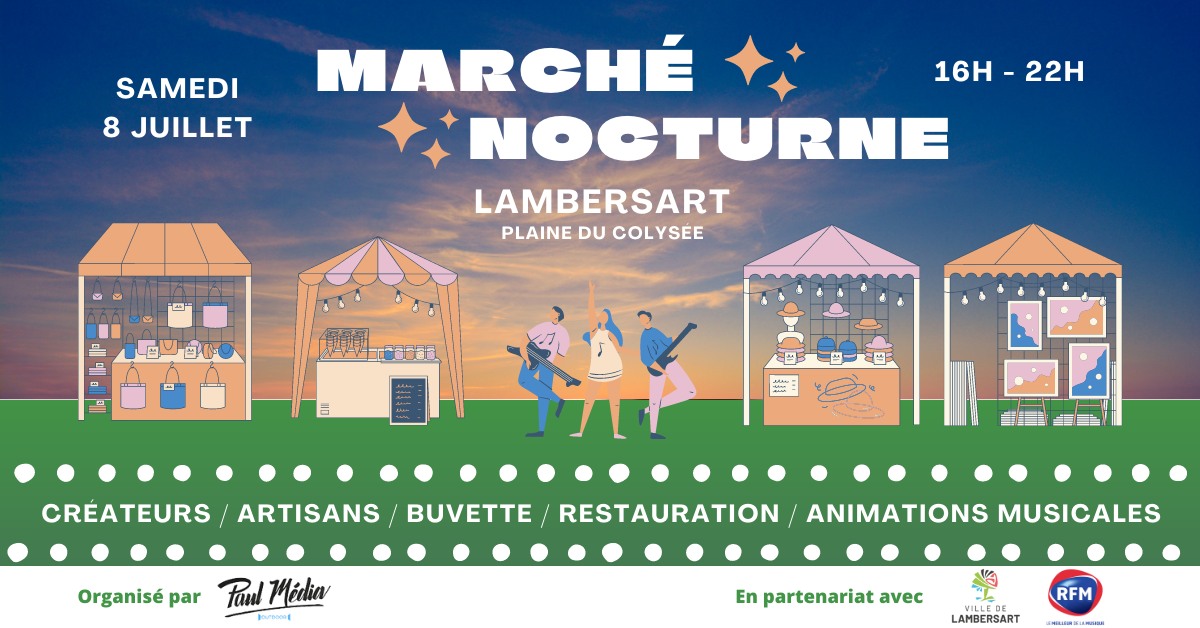 "Le marché nocturne de Lambersart vous donne rendez-vous le samedi 8 juillet 2023 de 16h à 22h sur les Berges de la Deûle (plaine du Colysée). Les créateurs, artisans et commerçants des Hauts-de-France viendront exposer leurs produits. Les promeneurs pourront alors découvrir différents stands, écouter de la musique et se restaurer. Une buvette et des foods trucks seront également tenus près des stands. Nous vous attendons nombreux pour partager avec nous ce moment convivial !"