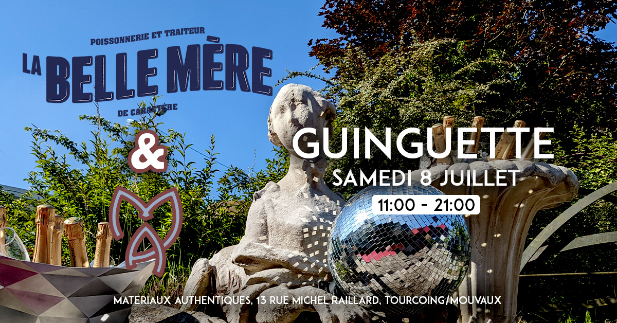 "Matériaux authentiques et La Belle Mère s'associent lors d'une journée Guinguette exclusive ! On vous propose de se retrouver toute la journée du 8 juillet (11h-21h) en plein air sur la terrasse ! Installez vous confortablement à une table ensoleillée pour y déguster huitres, planche terre ou mer arrosée de champagne, vin blanc / rosé ou bière le tout sur un son électro. Le showroom de Matériaux Authentiques et La Black Box Galerie avec sa nouvelle collection d'oeuvres seront évidemment ouverts toute la journée pour l'occasion ! Une journée de chine, de culture et de fun, quoi de mieux !"