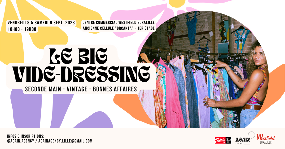"A la recherche d’un événement post-braderie pour continuer à chiner ? Après une 1ère édition réussie en avril dernier, le centre Westfield Euralille et Again Agency organisent une seconde édition du “Big Vide-Dressing” les 8 et 9 septembre prochains : le bon plan de la rentrée pour refaire sa garde-robe en mode slow-fashion. Au 1er étage du centre dans la l’ex-boutique Orcanta, les aficionados de seconde-main feront le plein de pièces iconiques et d’essentiels à prix réduits."