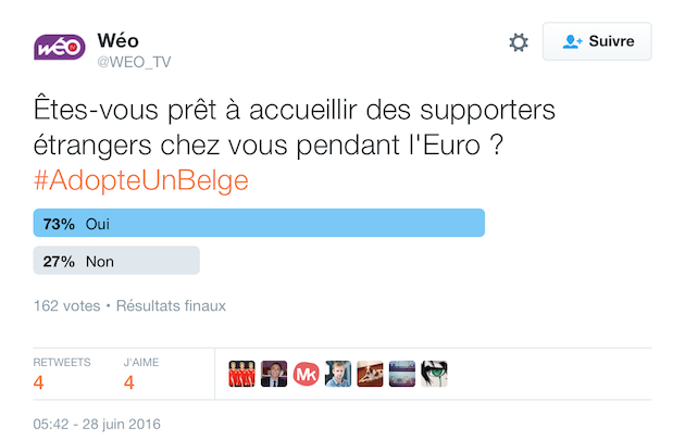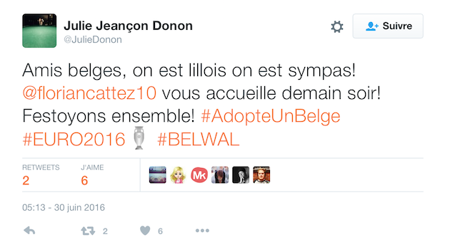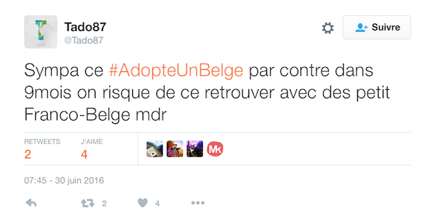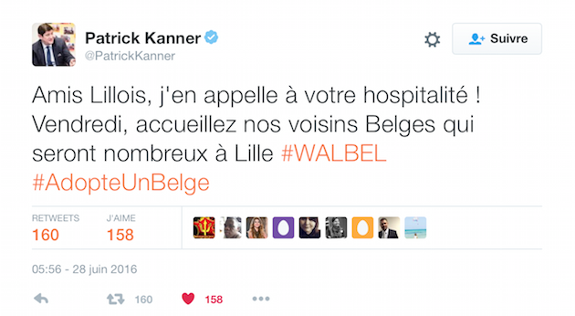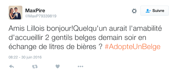 Si l'expérience vous tente, direction Twitter et le hastag #AdopteunBelge pour retrouver les demandes de nos amis frontaliers. Vous passerez à coup sûr une bonne soirée et vous serez crédité d'une bonne action. Ben oui, ça évitera aux soulards de rentrer torchés et de provoquer un accident de la route. Cette initiative a même été validée par le ministre de la Ville, de la Jeunesse et des Sports Patrick Kanner.