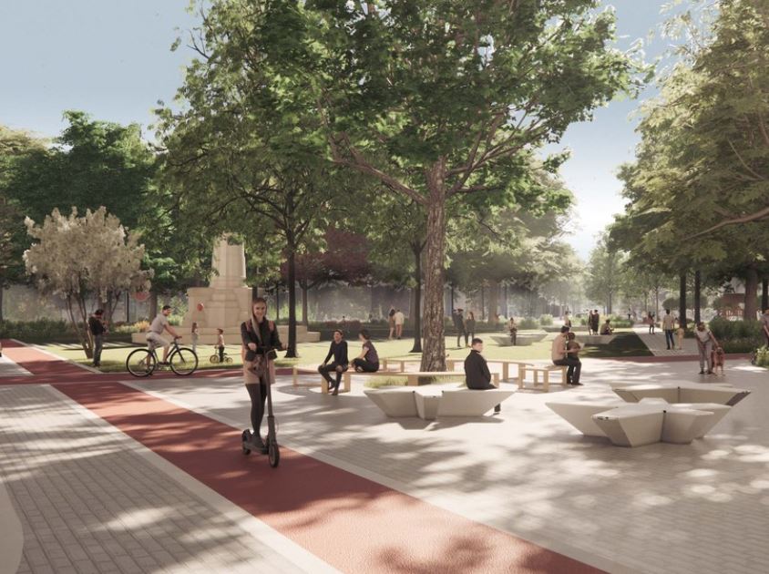 "Ambition : créer un véritable parc qui s'appuiera sur les arbres existants, et de nouveaux espaces de détente et à hauteur d'enfant, dans un écrin végétal. L'amélioration des circulations piétonnes, cyclables, et l'anticipation de l'arrivée du futur bus à haut niveau de service complètent cette métamorphose."
