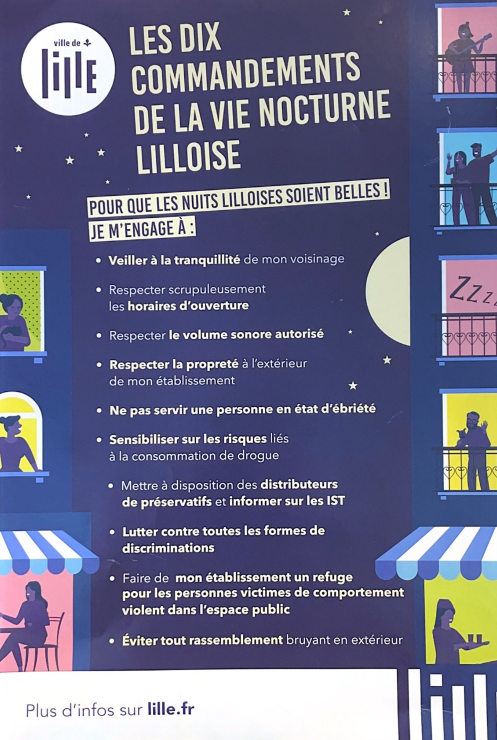 La Ville de Lille poursuit sa lutte acharnée contre les mauvais comportements durant les nuits Lilloises. Les terrasses doivent fermer plus tôt ainsi que les bars, et désormais elle publie ses 10 commandements de la vie nocturne à Lille. Une liste de bonne conduite pour trouver un équilibre entre les fêtards et les riverains.