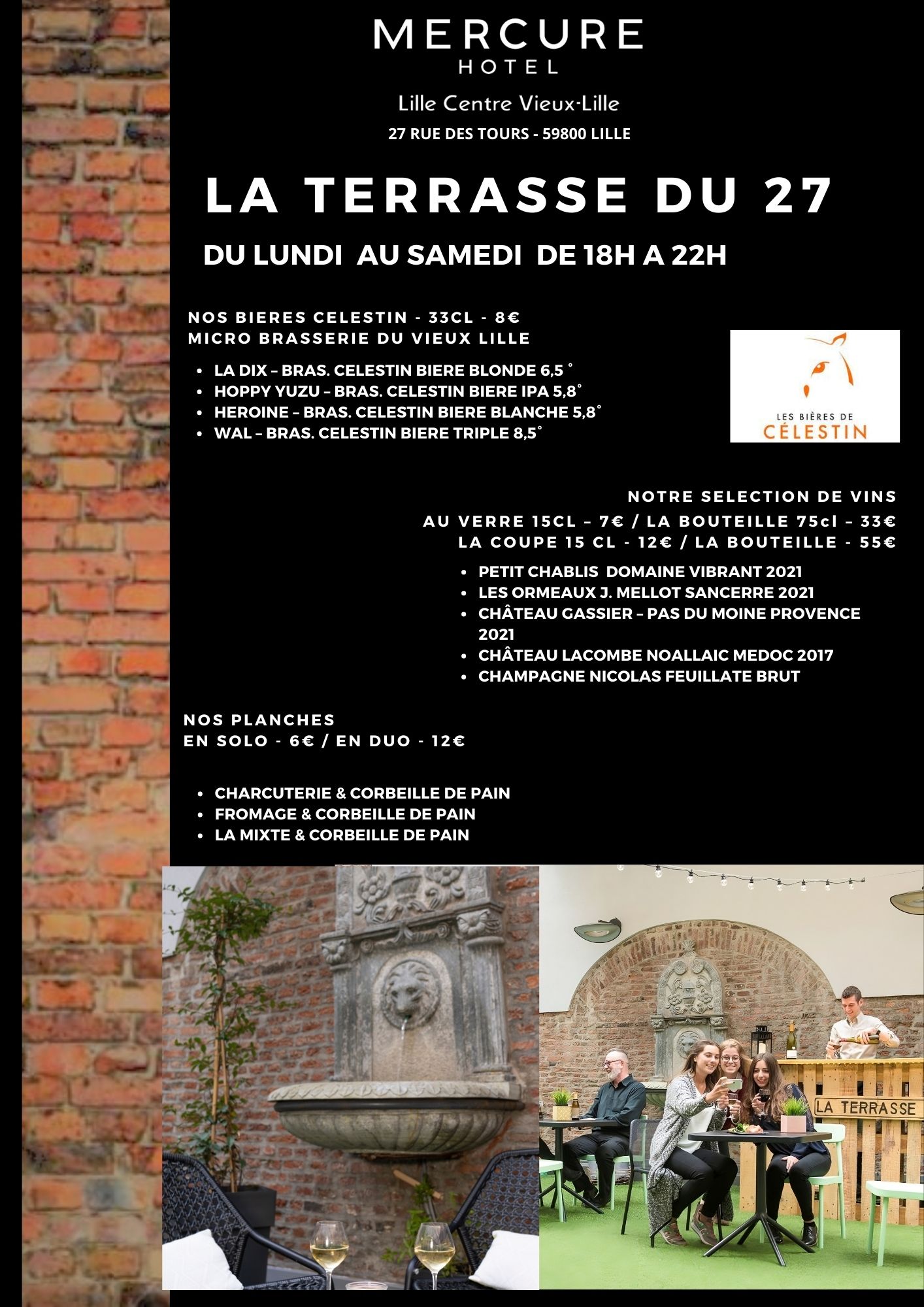 La Terrasse du 27 est le petit trésor que vous propose l'hôtel Mercure Lille Centre Vieux-Lille. Ici, c'est une véritable bulle hors du temps qui vous attend. A l'image de notre belle Capitale des Flandres, l'hôtel regorge de détails décoratifs qui rappellent la vieille ville et son patrimoine. La Terrasse du 27 n'est pas en reste ! Cachée dans le patio de l'hôtel, elle compte tout de même 35 places assises ce qui en fait une des plus importante terrasse du Vieux-Lille. Notre coup de coeur ? Sa sublime fontaine qui nous berce de ses clapotis pendant qu'on boit un verre.