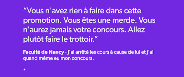 Sur Twitter, les étudiants ont dénoncé ces propos. Des anecdotes qui s'ajoutent au Tumblr "Paye ta Fac" lancé il y a un mois maintenant. C'est un projet féministe lancé par des étudiant-e-s d'Avignon dans le but de mettre en lumière les témoignages de sexisme ordinaire et de harcèlement sexiste au sein des universités et grandes écoles. On vous conseille d'ailleurs d'aller visiter leur site qui regorge de pépites misogynes....