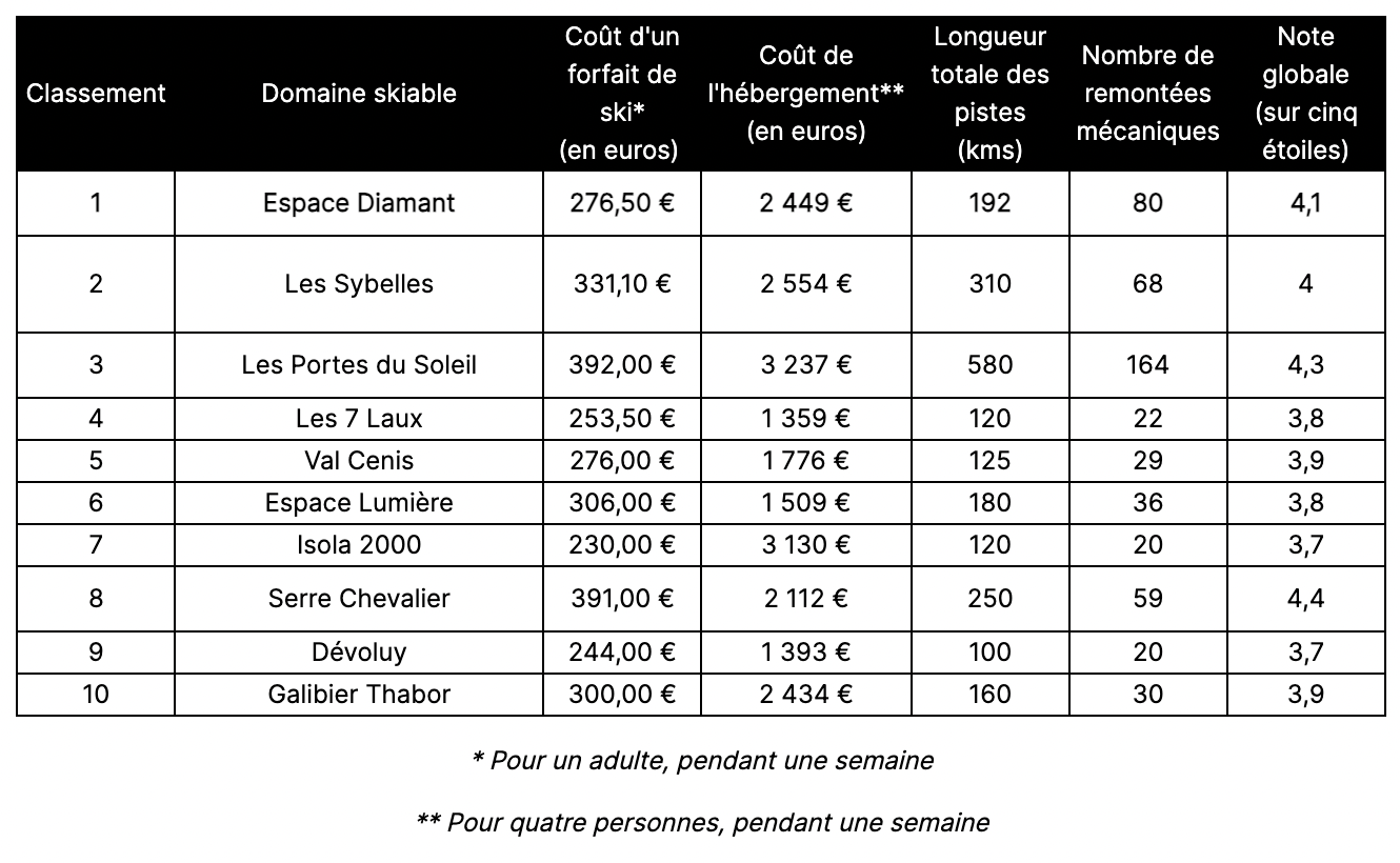Le grand gagnant de l’étude s’appelle Espace Diamant (grand domaine skiable regroupant Les Saisies, Crest-Voland Cohennoz, Notre-Dame-de-Bellecombe, Flumet - Saint-Nicolas-la-Chapelle et Praz-sur-Arly), et il coche (presque) toutes les cases. Avec un forfait hebdomadaire à moins de 300 euros, le domaine s’impose comme le plus avantageux financièrement. Bonus non négligeable : 68 % des pistes sont classées faciles, ce qui en fait aussi le terrain de jeu idéal pour les débutants ou les familles qui veulent skier sans pression… ni ruiner le livret A.