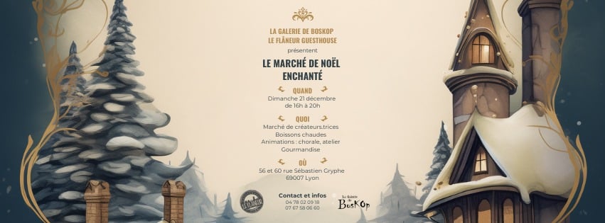 Le Flâneur Guesthouse accueille un Marché de Noël Enchanté aussi créatif qu’engagé. La Galerie BosKop réunit, le temps d’un après-midi à la Guillotière, une sélection d’artistes aux univers singuliers : sérigraphie, BD, illustrations poétiques, fanzines et créations textiles décalées. Un rendez-vous chaleureux pour dénicher des cadeaux originaux et soutenir la création indépendante. De 16h à 20h, entrée gratuite, esprit festif garanti.