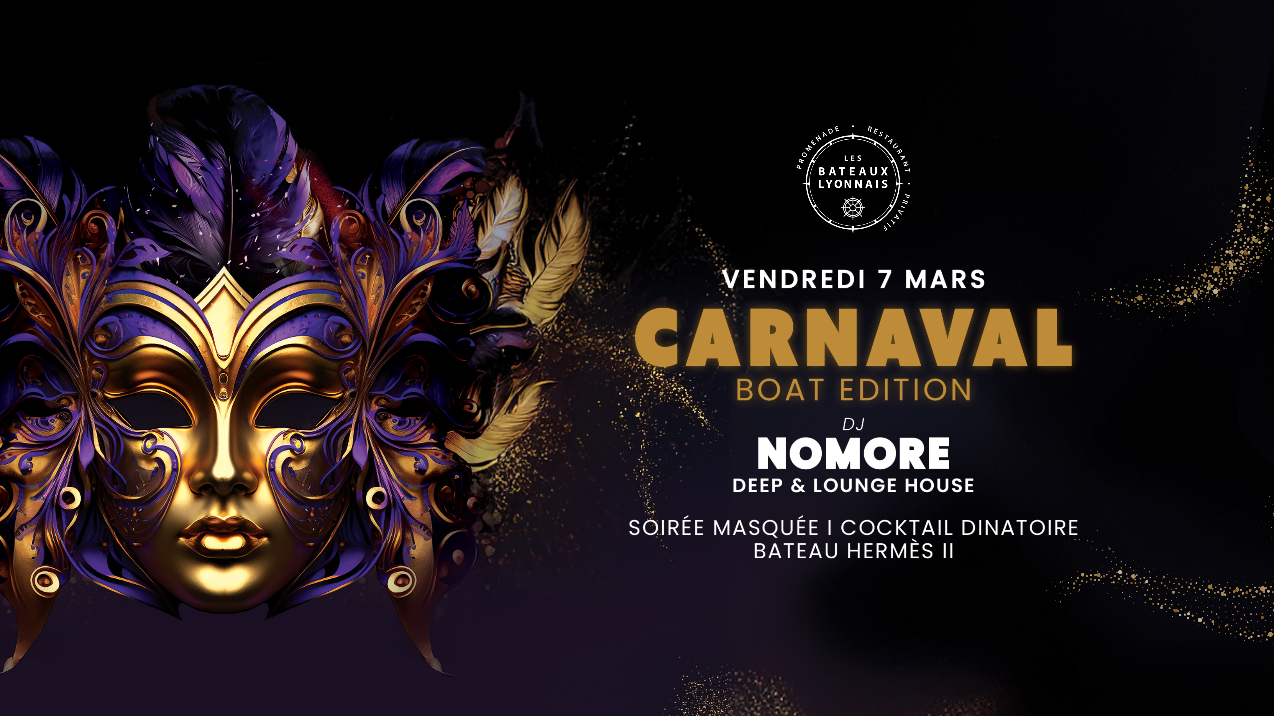 Ce vendredi 7 mars, embarquez pour une croisière enflammée sur la Saône avec la soirée Carnaval Boat Edition ! À bord du célèbre Hermès II de la célèbre compagnie Les Bateaux Lyonnais, préparez-vous à 3h30 de fête entre DJ set, cocktails et ambiance électrisante. Aux platines, on retrouve NOMORE pour un set deep & lounge house qui fera vibrer le bateau. Une soirée fluviale avec cocktail dînatoire, finger food, beignets, crêpes, bonbons et bien plus encore mais aussi un dress code avec masque obligatoire, mystère et élégance.