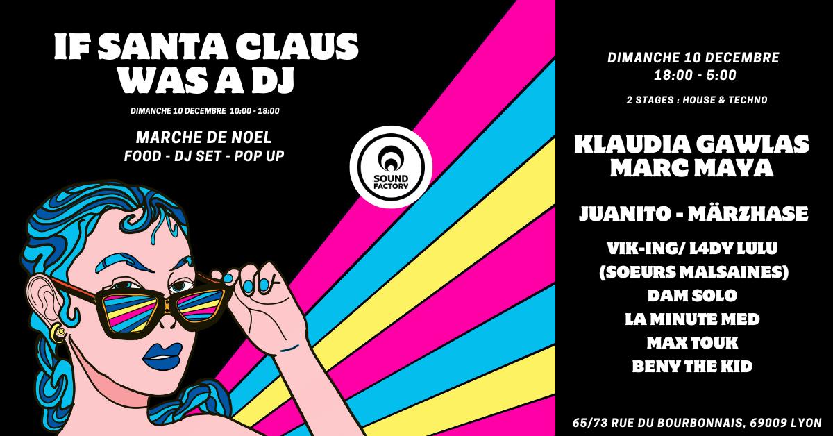 Ce dimanche, le Sound Factory transforme son club en un authentique marché de Noël. Au programme : friperies, bijoux, épiceries fines, créateurs locaux, tatouages, illustrations, customisation de sneakers, une partie food et un bar. L'événement se divisera en deux parties : l'adresse ouvrira ses portes de 10h à 18h pour le marché de Noël éphémère avant que le club ne reprenne ses droits pour la soirée "If Santa Claus Was A DJ" avec une programmation full techno d'un côté et un line-up House solaire de l'autre !