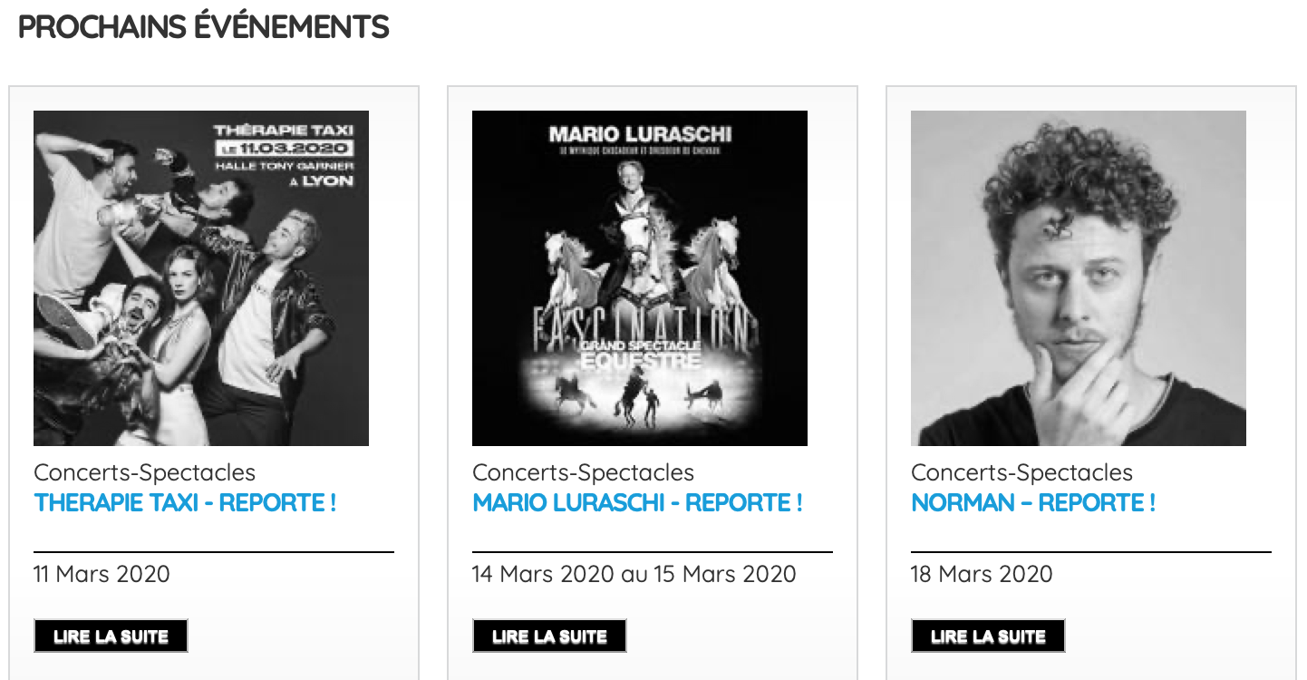 Après le report de la Foire de Lyon (du 16 au 24 mai) et les annulations de Tomorrowland Winter et du Salon du Randonneur la semaine dernière, d’autres annonces ont vite suivi. Sur la seule journée de mardi, plusieurs couperets sont tombés : Lyon Bière Festival est reporté du 31 octobre au 1er novembre, le festival Les Mauvais Gones se fera à une date à définir, la venue du cirque du soleil à Lyon est annulée, Le Printemps des Docks et Le Marché de la Mode Vintage sont tous deux reportés respectivement du 20 au 22 novembre et du 17 au 18 octobre.