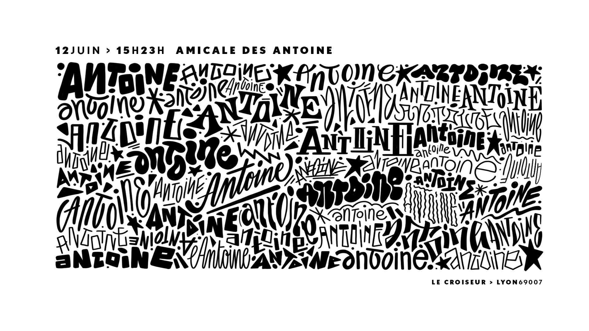 Comme les grands de ce monde, tu t’appelles Antoine ? C’est ton jour de chance : ce samedi, le bar du Croiseur dans le 7e organise le premier événement réalisé exclusivement par des Antoine. Au programme : diffusion d’un documentaire d’Antoine explore la France, Live painting et expo par l’artiste Antwan stk et DJs set par Antoine, Antoine, Antoine & Antoine ! Oui, c’est à la fois étrange et génial (et tu peux évidemment venir même si tu n’as pas la chance de porter ce nom béni des dieux).