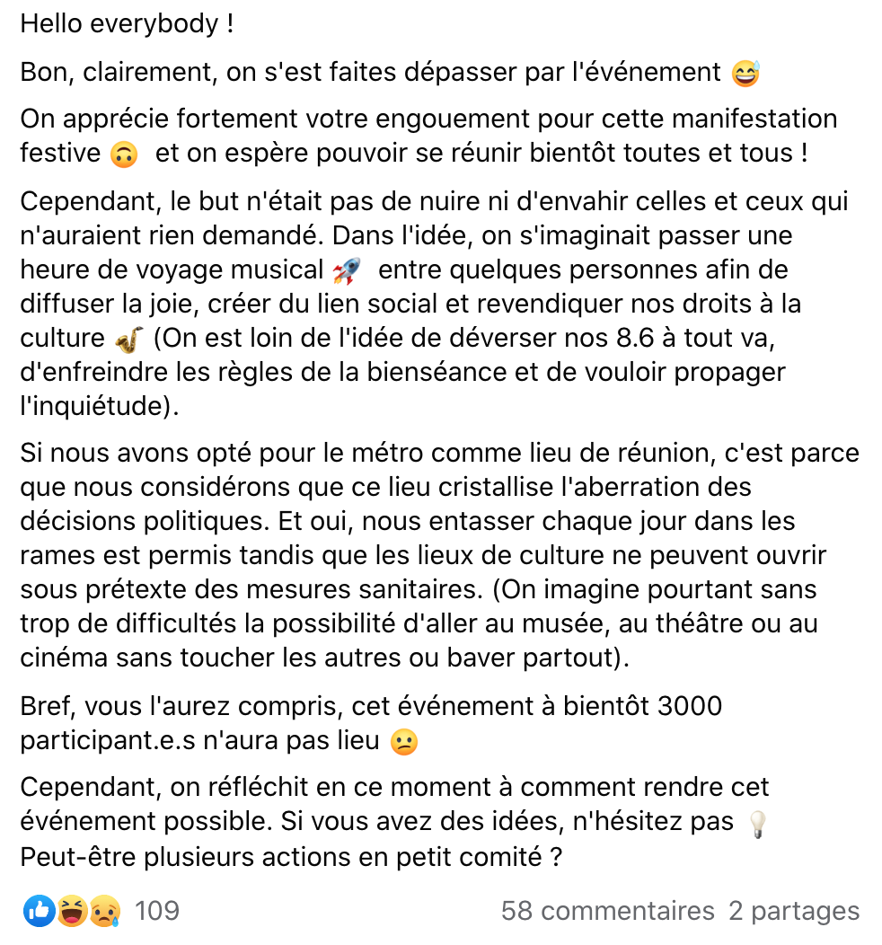 Le concept est simple : se retrouver pendant une heure dans une rame de métro et faire la fête comme au bon vieux temps. L’évènement invite aussi les participants à ramener un « breuvage discret », chose que l’on ne cautionne évidemment. Derrière ce rassemblement se cache surtout un message : danser en signe de protestation contre « le sacrifice de la jeunesse et de la culture, contre des mesures sécuritaires qui profitent seulement à notre économie, en oubliant l’humain qui l’a fait tourner », peut-on lire sur l’évènement.