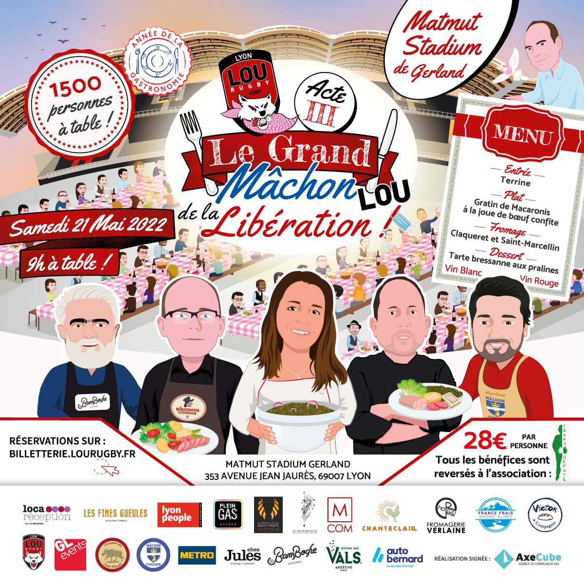 Une renaissance qui donne faim forcément une faim de LOU… Le 21 mai prochain, la 3e édition du plus grand mâchon du monde débarquera au stade du LOU Rugby, le Matmut Stadium de Gerland, pour régaler quelques 1 500 Lyonnais à partir de 8h du matin. Nommée le « Grand Mâchon LOU de la libération, acte III », cette régalade en règle sera aussi l’occasion de partager un moment convivial et ce pour la bonne cause puisque l’intégralité des bénéfices générés sera reversée à l’association « Résurgence Transhépate Rhône-Alpes » qui oeuvre aux côtés des greffés du foie.