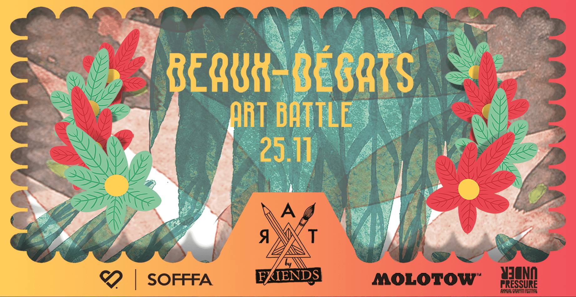 Finis les vernissages embourgeoisés, les attitudes, l'élitisme et les égos ! Beaux Dégâts est là pour ramener une réalité : celle de nos artistes de rue. Alors pour faire chauffer les foules, la team organise une art battle au Sofffa Guillotière. Pendant plus de deux heures, 4 équipes d'artistes improviseront des murales sur des thématiques distribuées le soir de l’évènement. Un event artistique, ludique et alcoolique (oups…).