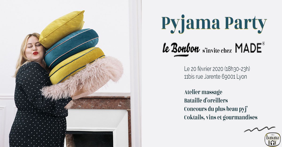 Nous voici déjà de retour avec un évènement à la fois inédit et insolite : une Pyjama Party rock dans une boutique de déco. Le 20 février, la team du Bonbon s’invite chez MADE.com pour réveiller l’enfant qui sommeille en vous. Au programme : dress code pyjama, massages crâniens, chocolat chaud, food healthy, dégustation de jus oubliés, DJ set, concours du plus beau pyjama et une bataille d'oreillers géante ! Le tout en formule all inclusive pour 20€.