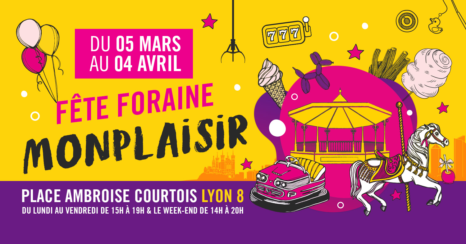 La fête foraine de Monplaisir s'installe du 5 mars au 4 avril sur la place Ambroise Courtois dans le 8e. Au programme : churros et barbe à papa, pinces, trampoline et manèges pour amuser petits et grands. Ouvert tous les jours de semaine de 15h à 19h et le week end de 14h à 20h.