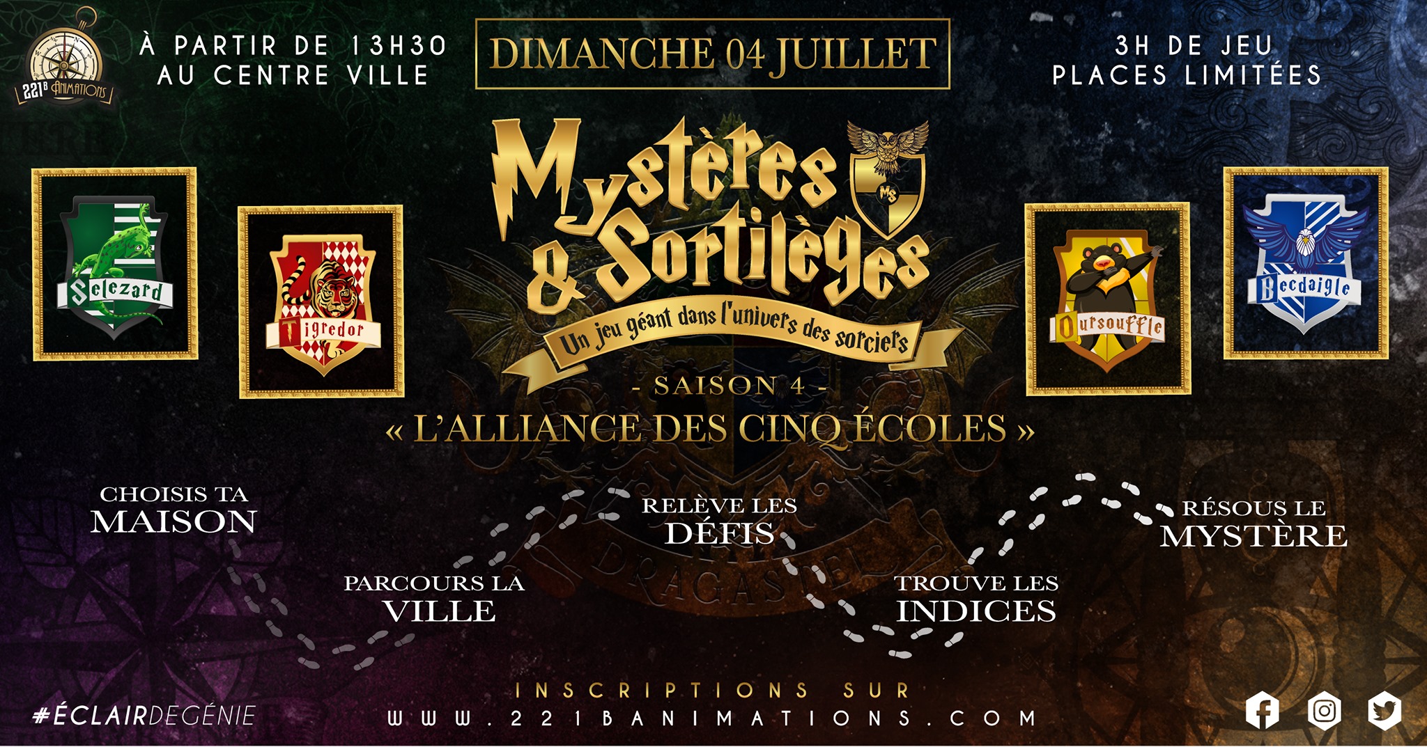 Après une plusieurs éditions qui ont connu un véritable succès, 221B Animations (l'entreprise organisatrice) revient dans la région avec un nouveau scénario. La date ? Ce dimanche dès 13h30. « Mystères & Sortilèges : L’alliance des Cinq écoles » sur l’univers Harry Potter débarque dans les rues du centre-ville de Villeurbanne.. N'oubliez pas votre Eclaire de Feu pour aller plus vite !